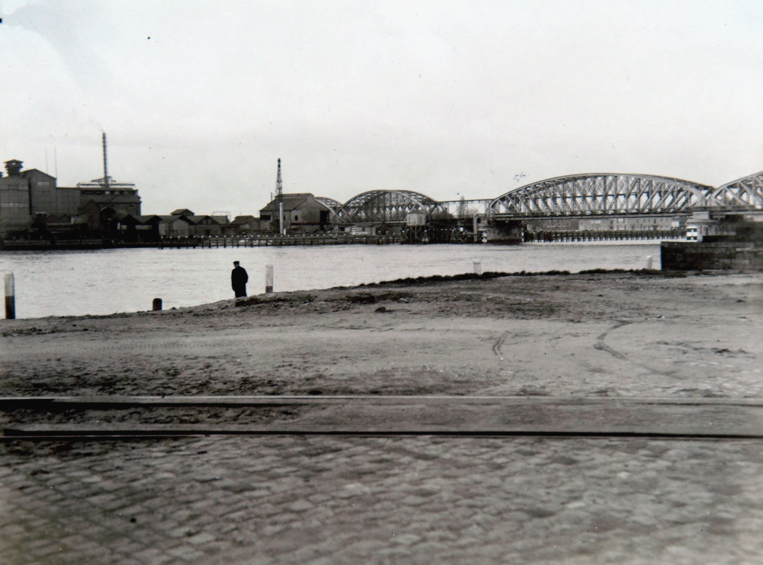 De spoorbrug naar Zwijndrecht gezien vanaf de 's-Gravendeelsedijk nabij het Papegat. Links van de brug, in Zwijndrecht, slaat men proefpalen voor de nieuwe brug.