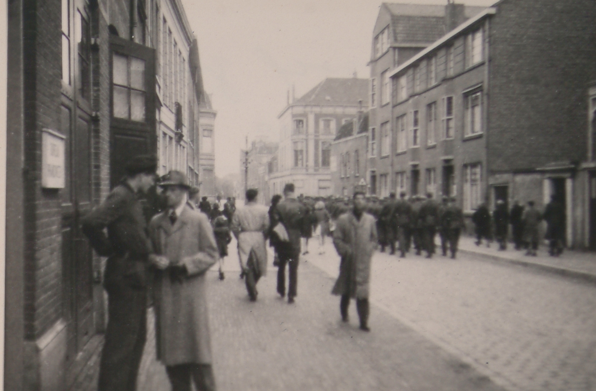 Een groep Duitse soldaten marcheert over de Vest naar het Steegoversloot op Dolle Dinsdag