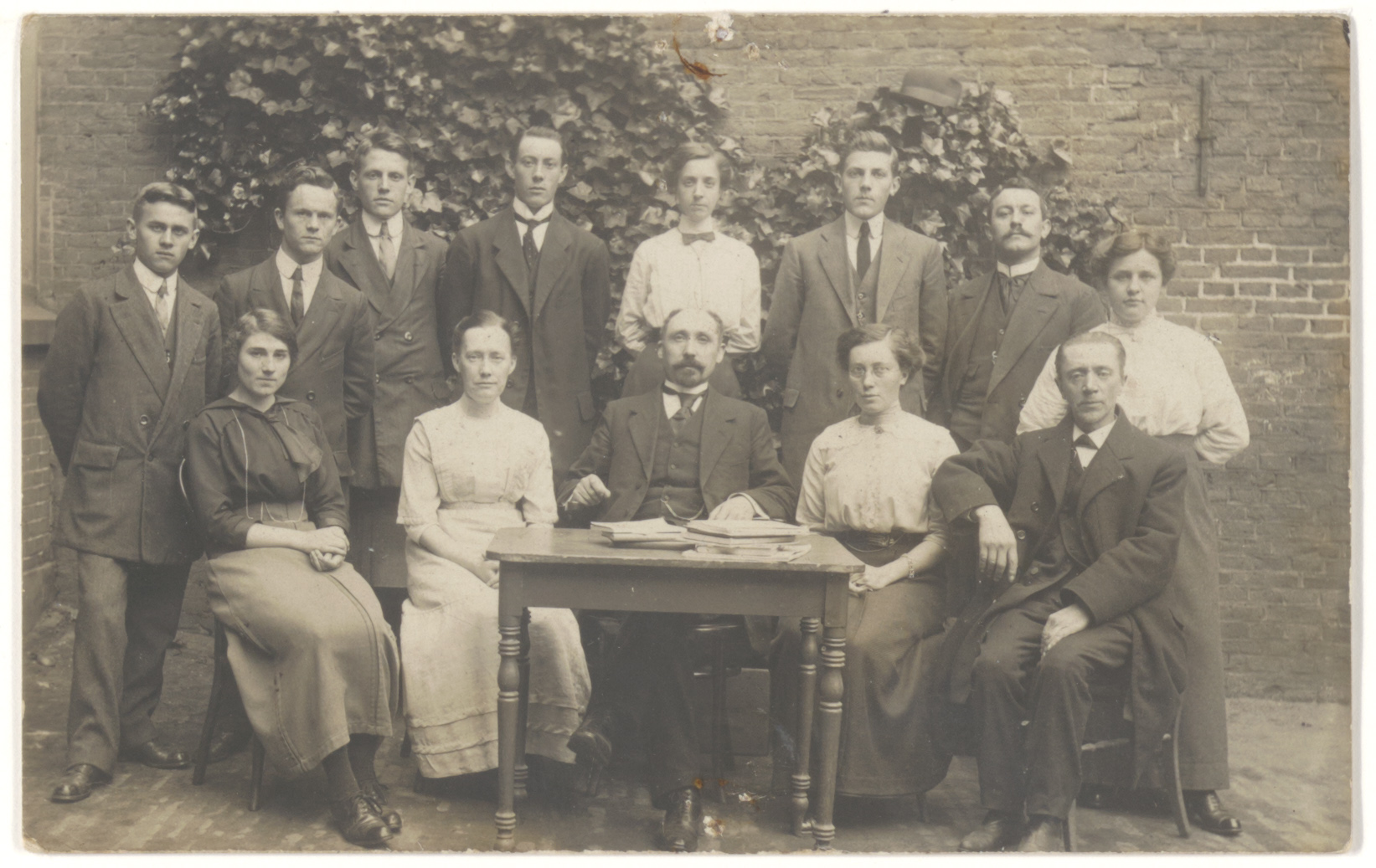 - Onderwijzend personeel van de Geref. School voor LO en ULO aan de Vrieseweg, poserend in de buitenlucht aan en rond een tafel. In het midden zittend het hoofd van de school, H.J. Motshagen; staande derde van rechts onderwijzer B.A. Schotel (later schoonzoon van Motshagen).