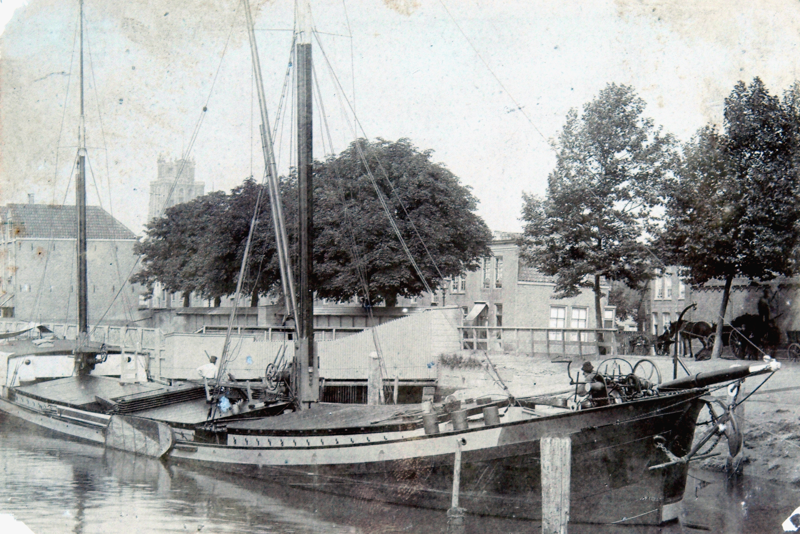 - Een schip in de Spuihaven ligt aan wal langs de Vest.