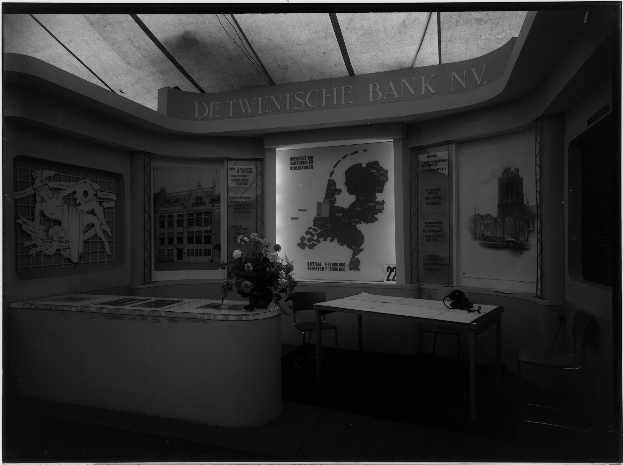 Stand van de Twentsche Bank aan de Wijnstraat/Scheffersplein op de Dawet
