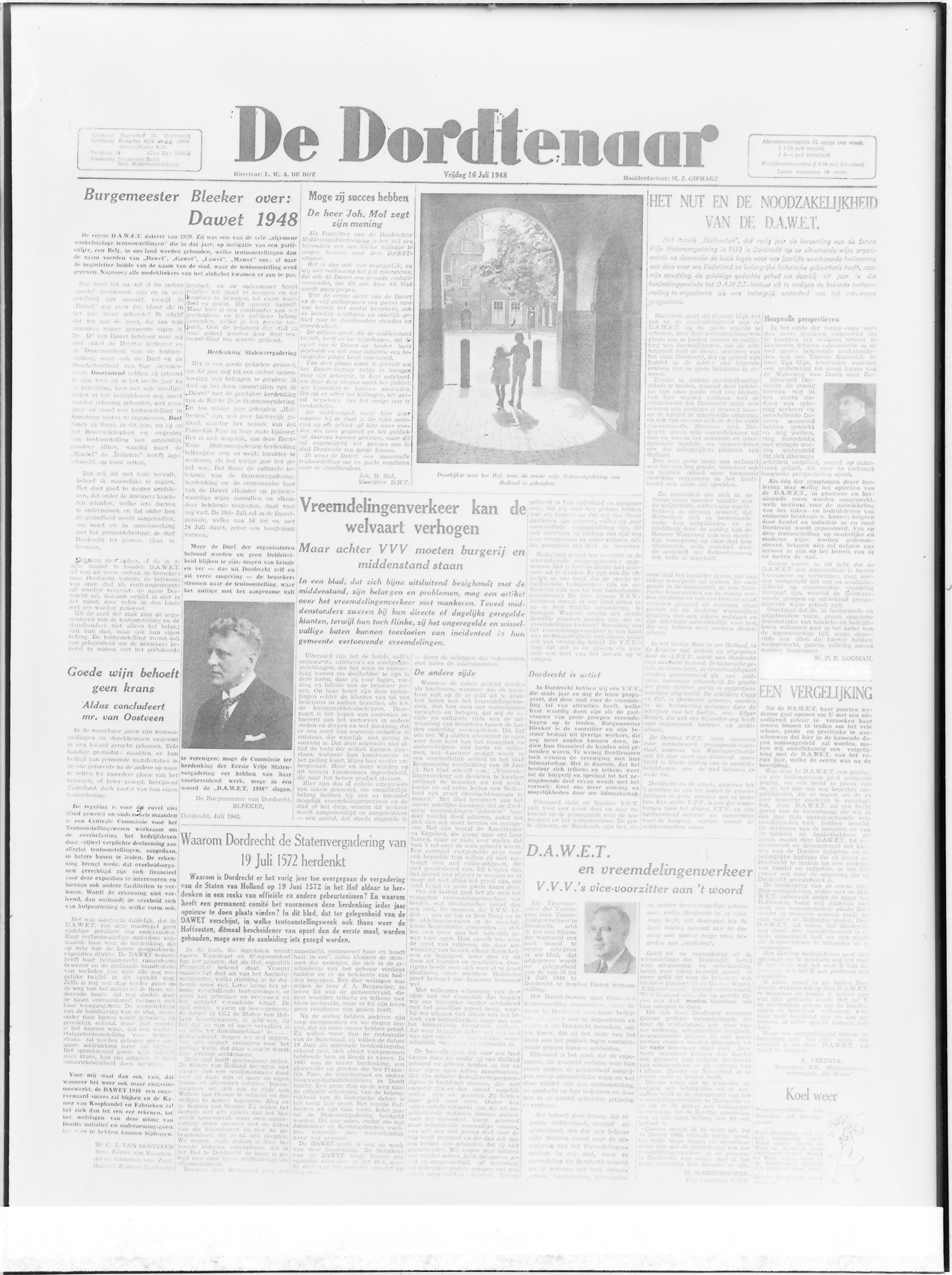 - Stand van dagblad De Dordtenaar met voorpagina van de krant van 16 juli 1948 op de Dawet