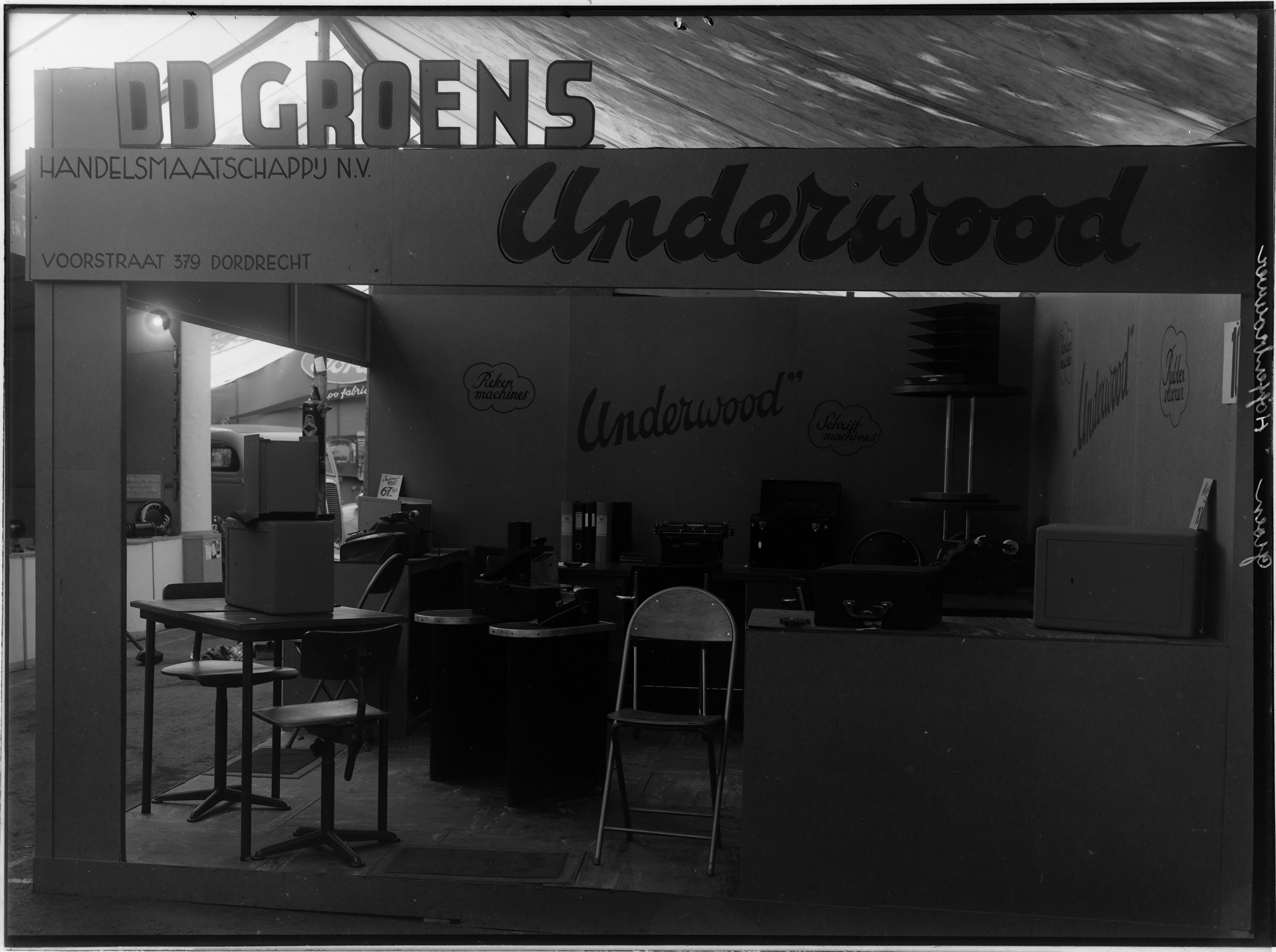 Stand van schrijfmachinehandel D.D. Groen aan de Voorstraat met Underwood-machines op …