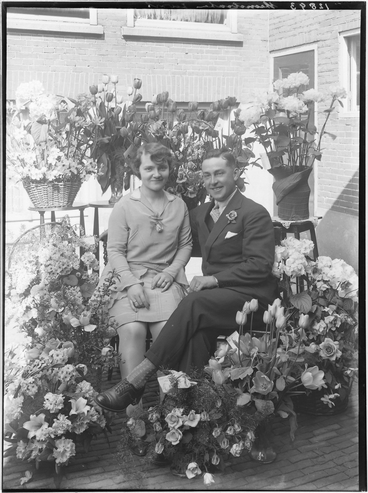 Het paar zit op een binnenplaatsje van de bakkerswinkel Riedijk 58.