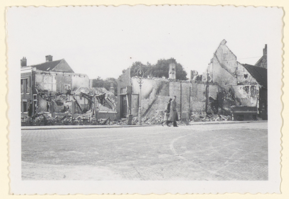 Verwoestingen door oorlogshandelingen in mei 1940 op de hoek Hoogt - Sluisweg.