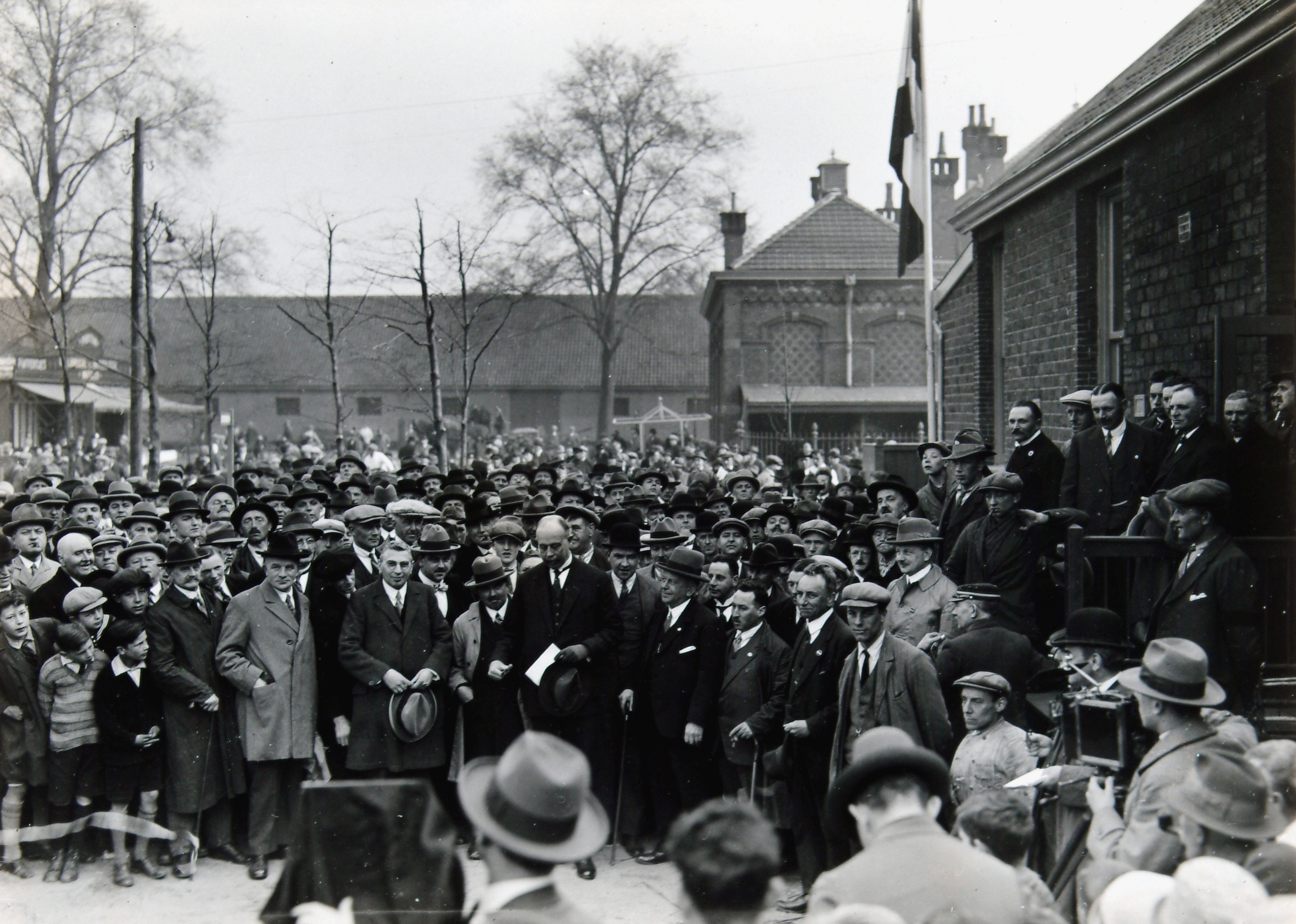 - Opening van de veemarkt op het Beverwijcksplein door burgemeester De Gaay Fortman met links van het wethouder Van Huiden (met de hoed in de hand). Het lange gebouw op de achtergrond is het rijksmagazijn aan de Cornelis de Wittstraat, opslagplaats van de pontonniers; dit gebied heet Achterlandswerf. Het gebouw rechts ervoor is het gymnasium.