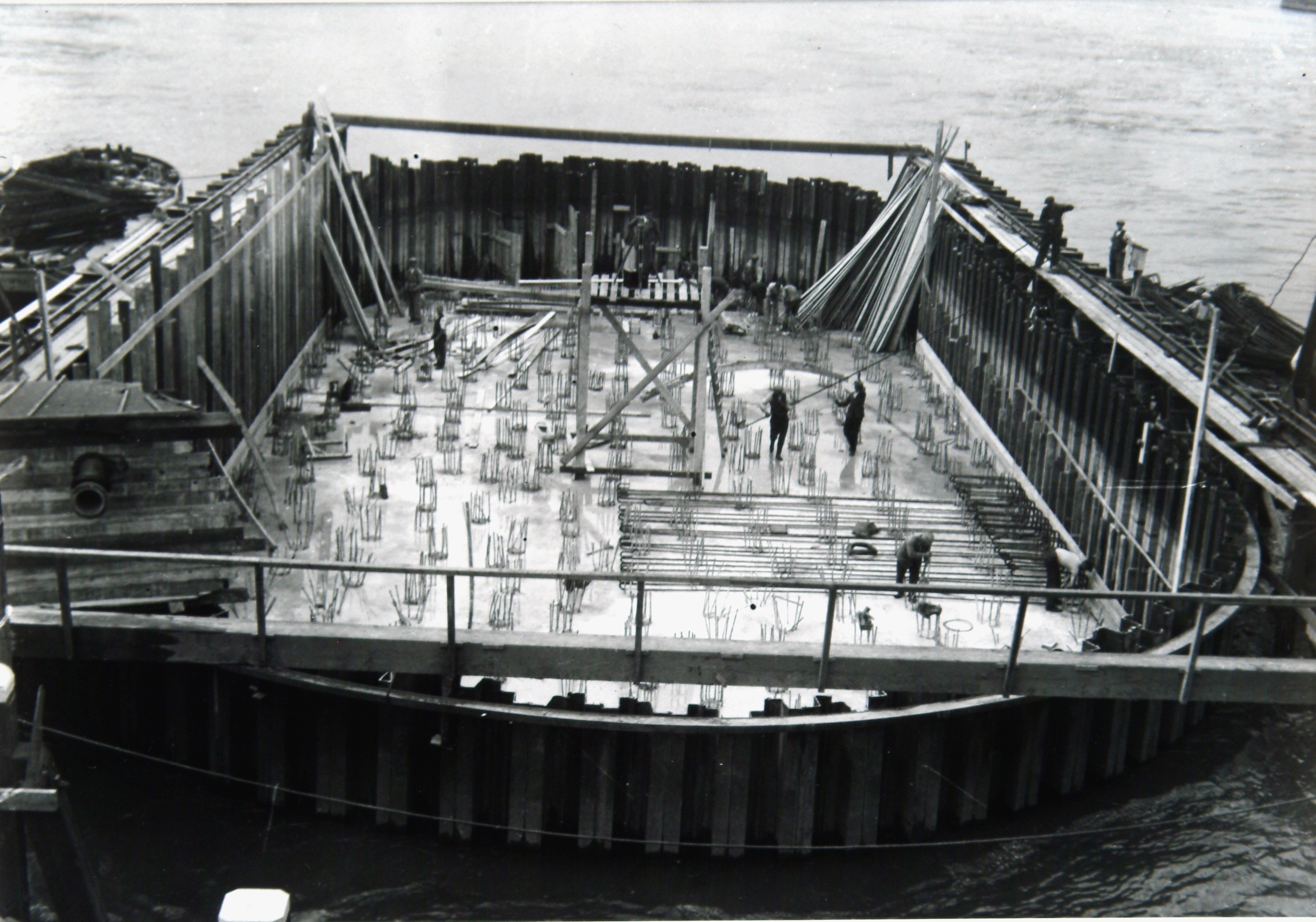 Betonvlechters bezig in een bouwput voor een pijler van de verkeersbrug over de Oude Maas.