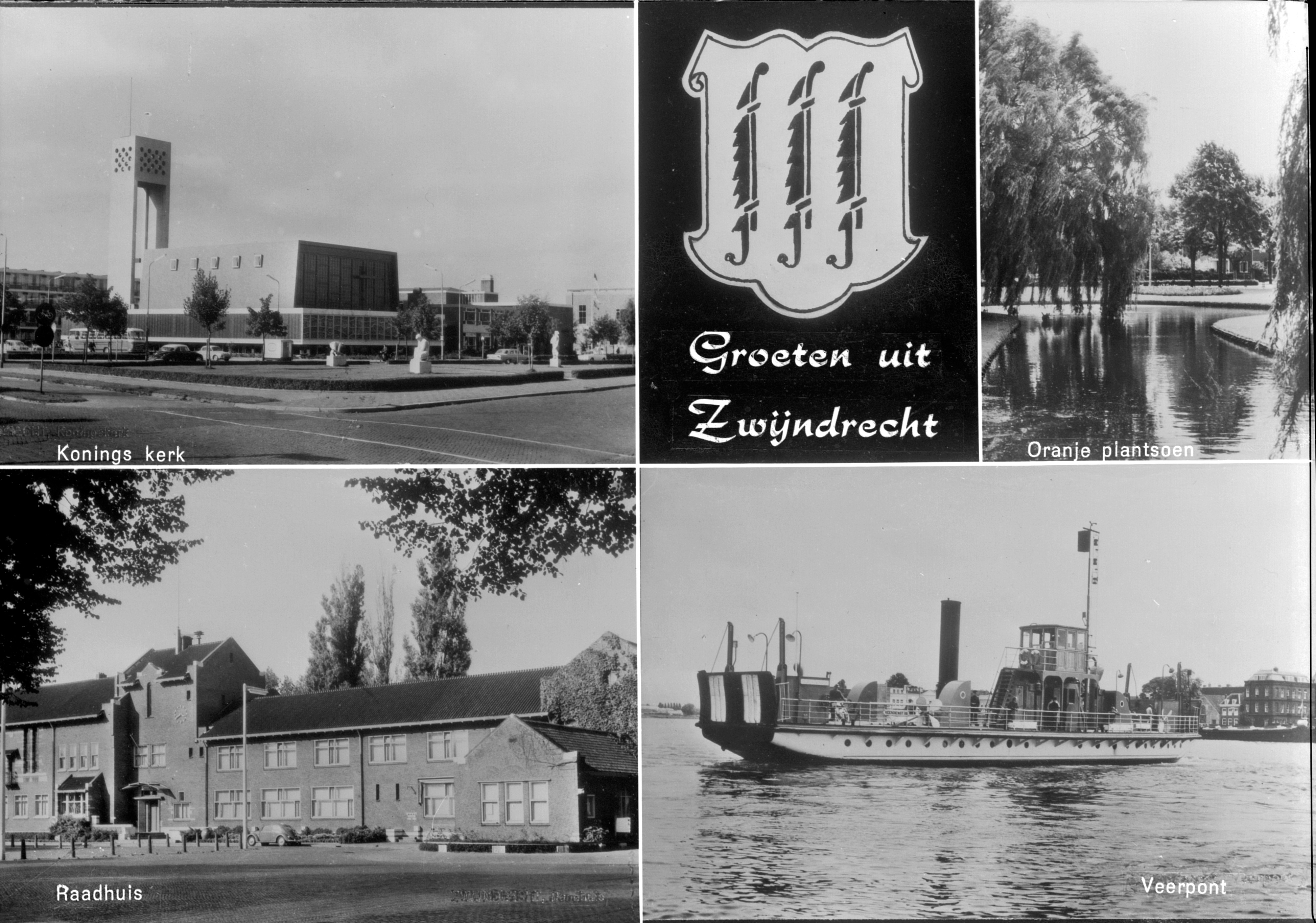 Prentbriefkaart uit Zwijndrecht. Linksboven: de Koningskerk op de hoek van de Burgemeester Jansenlaan en de Koninginneweg (rechts). Rechtsboven: het Oranjeplantsoen. Linkonder: het raadhuis aan het Raadhuisplein. Rechtsonder: veerboot op de Oude Maas.