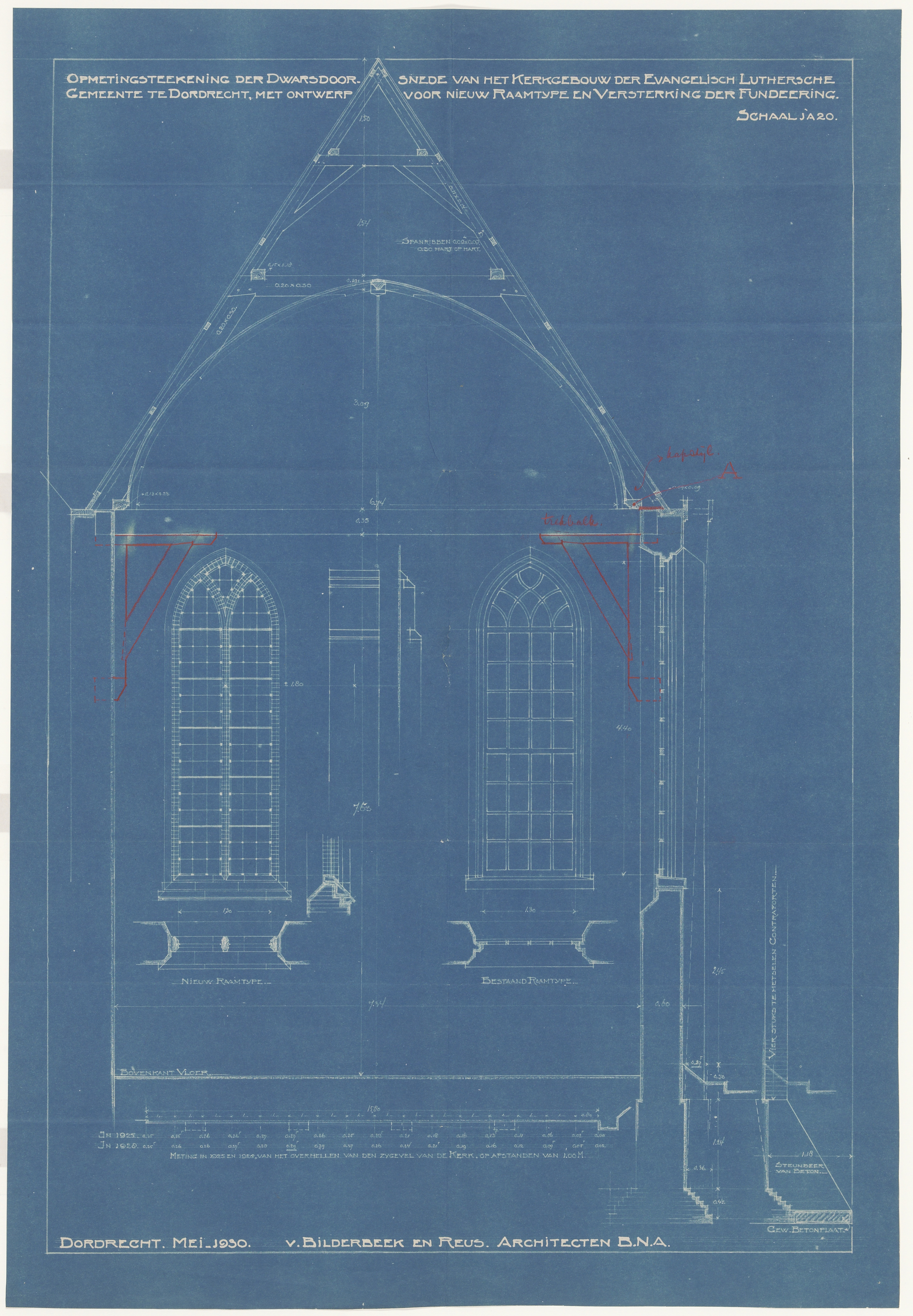Dwarsdoorsnede van het kerkgebouw van de Evangelisch-Lutherse gemeente aan de Vriesestraat i.v.m. nieuwe raamtypen en versterking van de fundering.