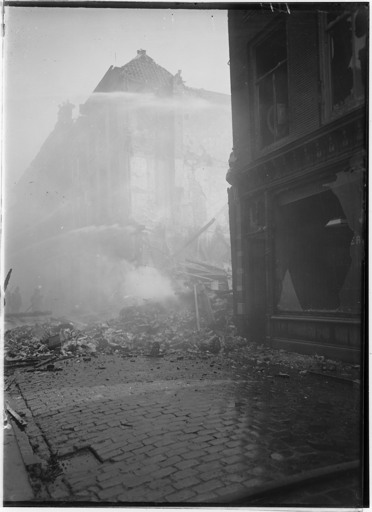 Gevolgen en nablussen van de brand bij drogisterij Köhn en Co. op de Voorstraat 392. Er gingen nog 6 huizen verloren en werden er 4 ernstig beschadigd