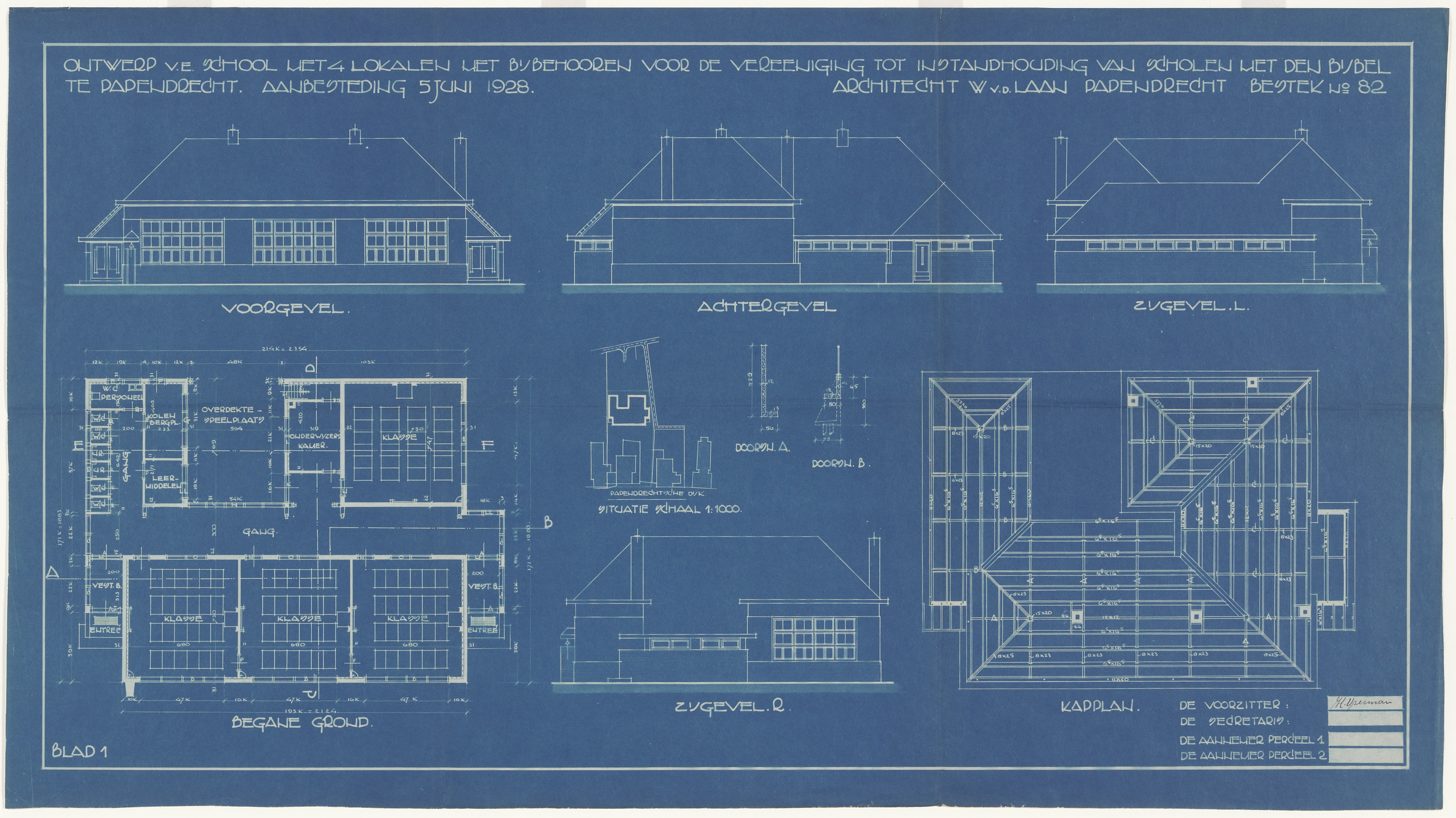 - Bouwtekening van een school met 4 lokalen voor de Vereniging tot Instandhouding van Scholen met den Bijbel te Papendrecht.