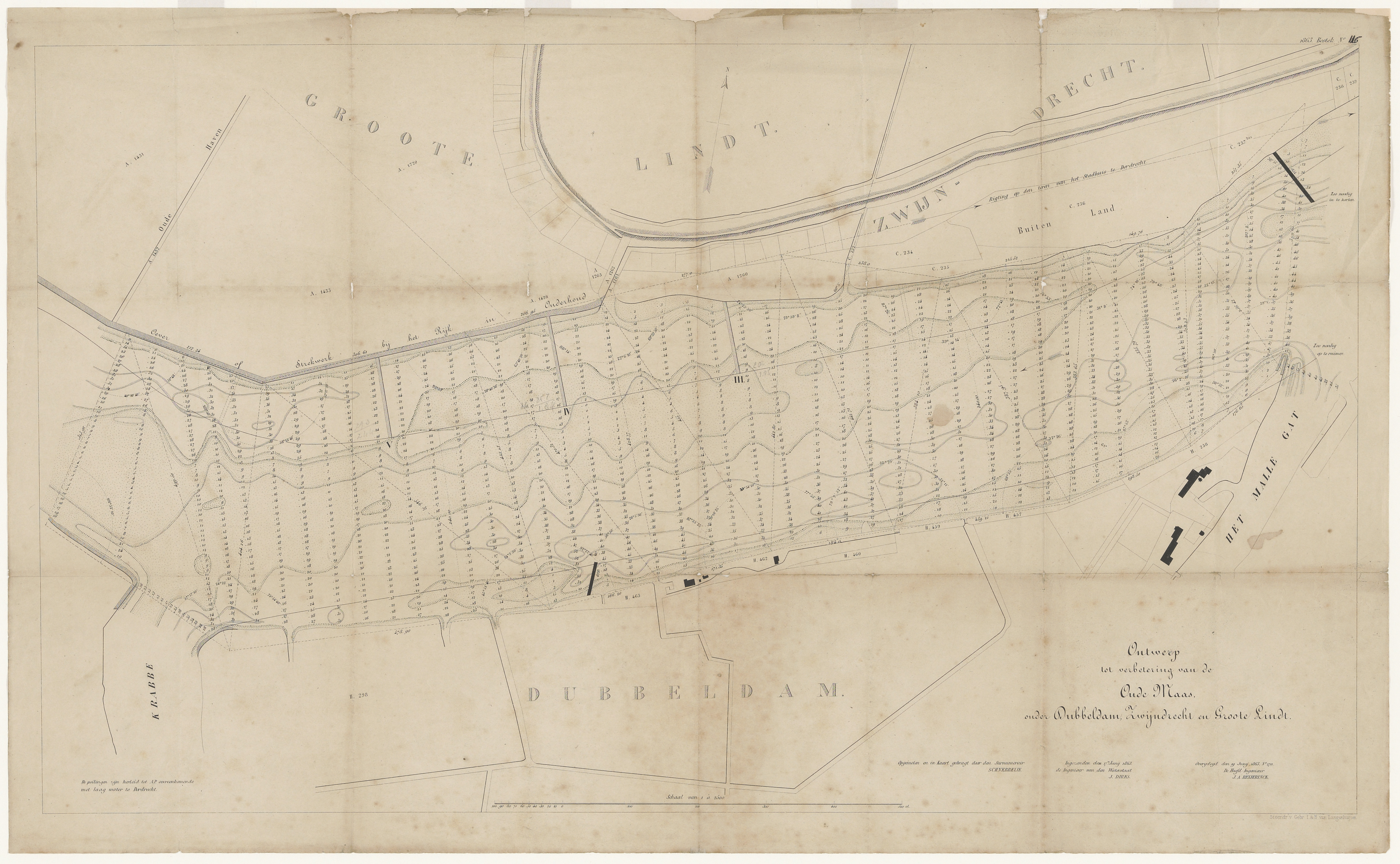 - Rivierkaart met dieptepeilingen van de Oude Maas bij het Mallegat, ontworpen ter verbetering van de rivier.
