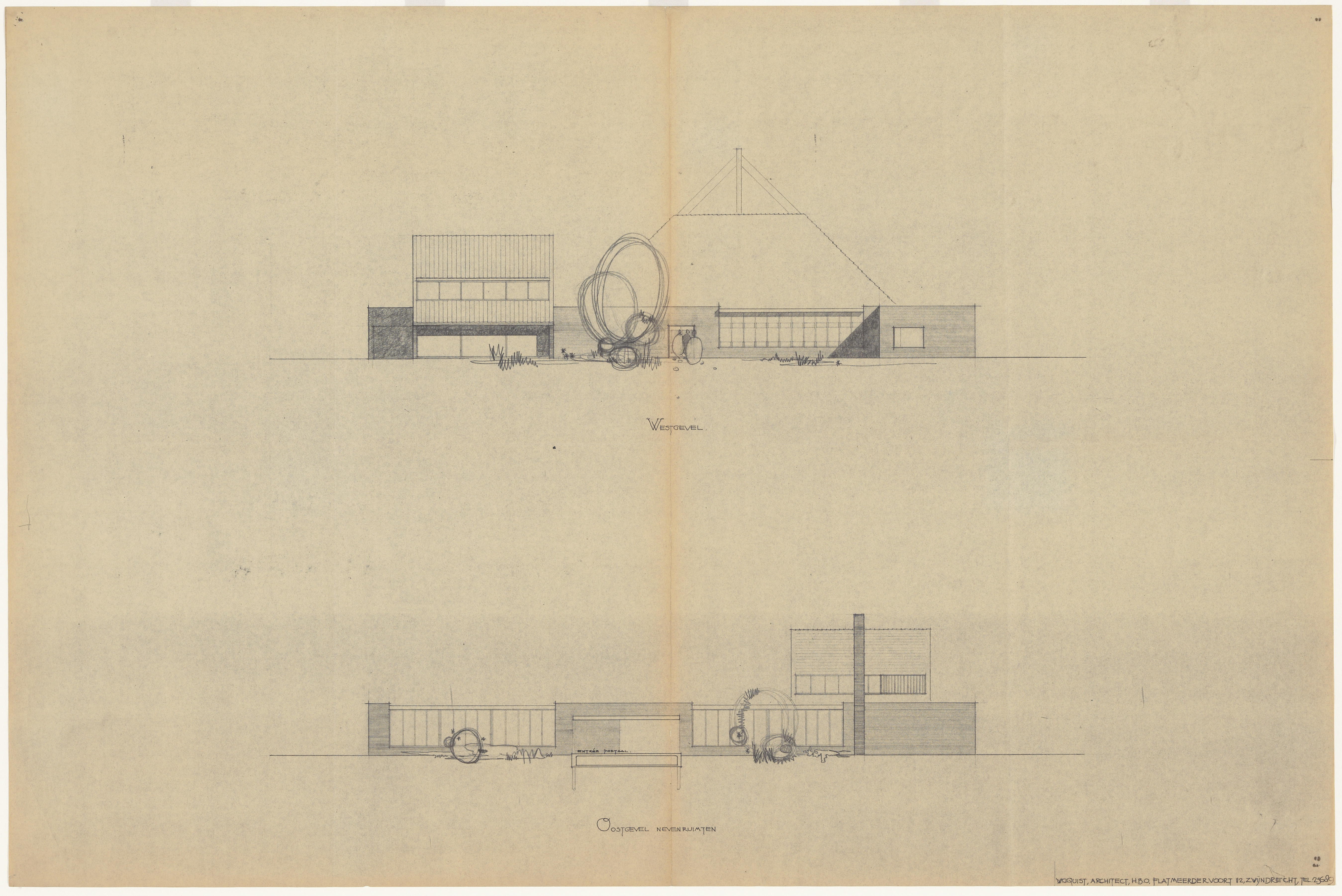 - Ontwerptekening van de west- en oostgevel van de gereformeerde Ichthuskerk aan de Frits Vogelstraat te Zwijndrecht.