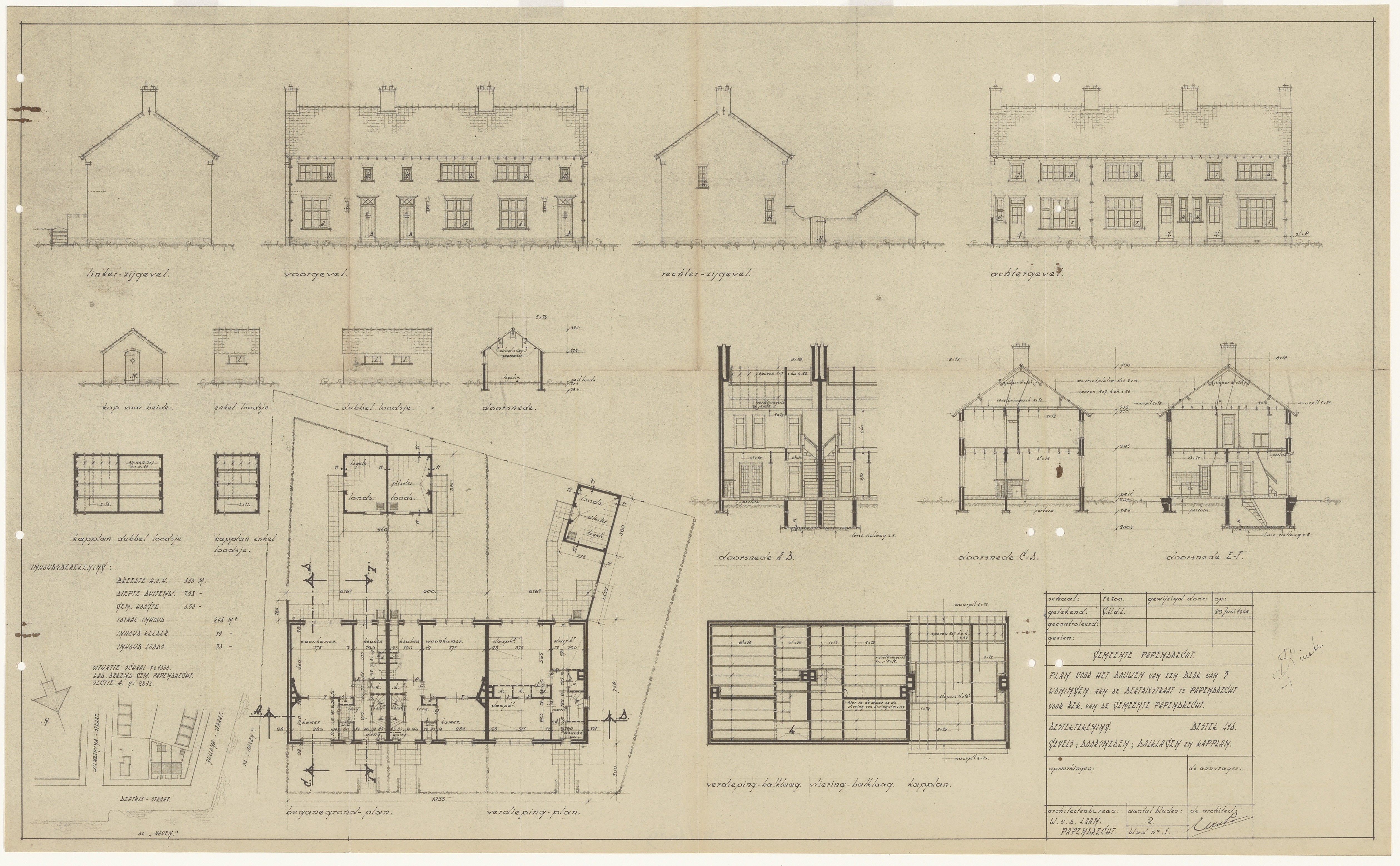 - Bouwtekening van een blok van 3 woningen aan de Beatrixstraat te Papendrecht.