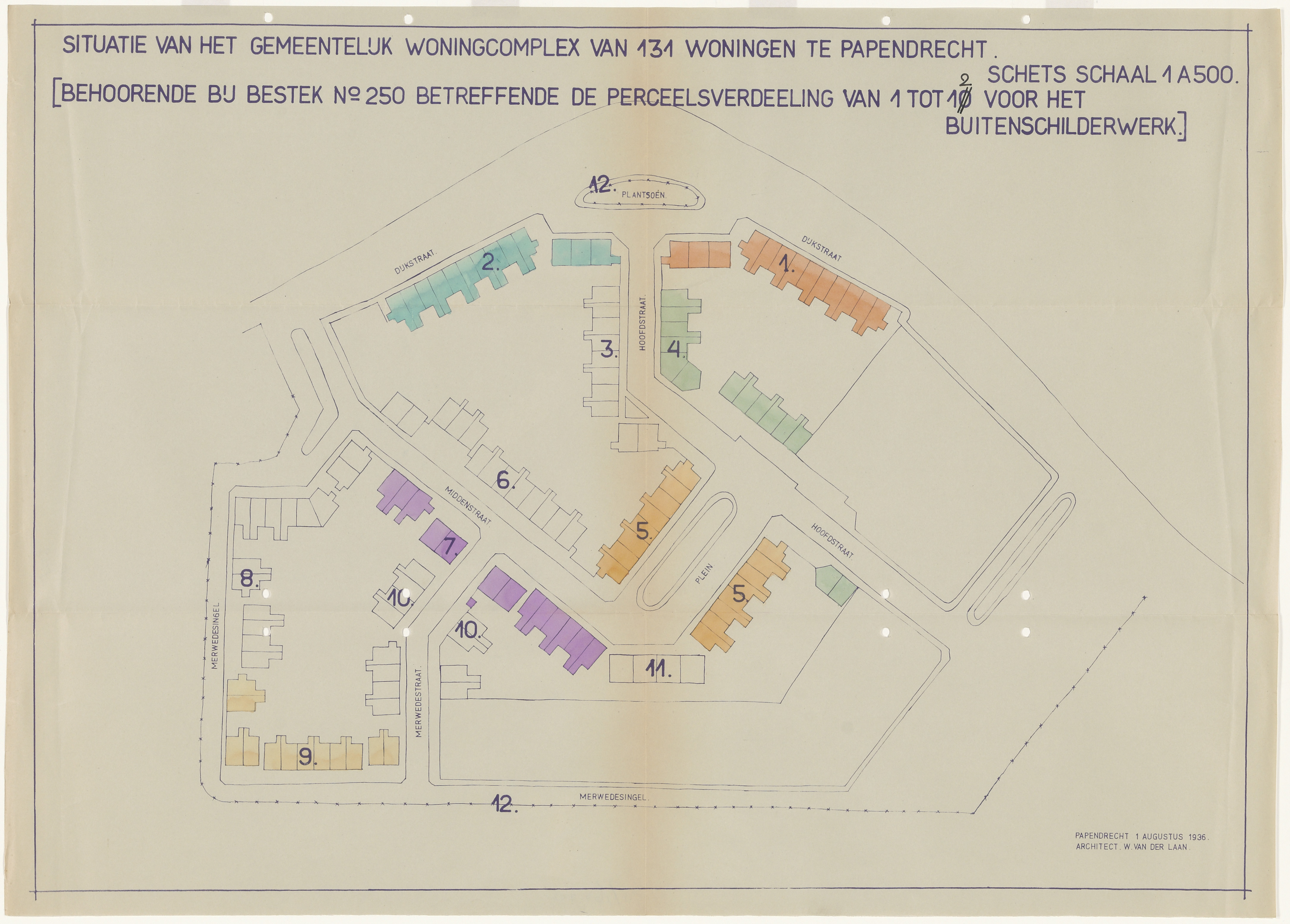 - Plattegrond van een woningcomplex van 131 woningen tussen de Merwedesingel en de Dijkstraat te Papendrecht.