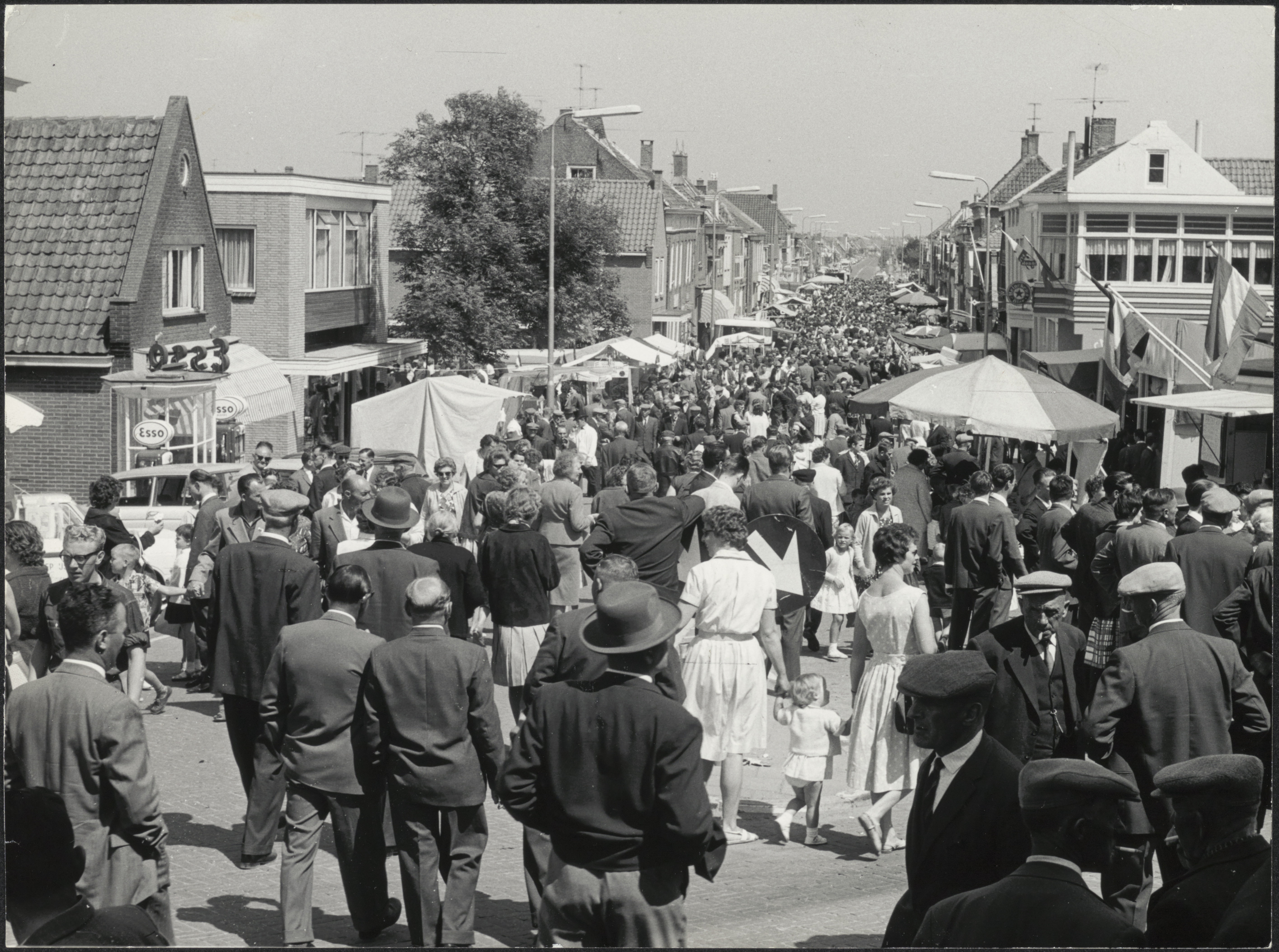 - Belangstellenden in de Voorstraat in Numansdorp bij het bezoek van koningin Juliana aan de Haringvlietbrug, gezien vanaf de Molendijk.