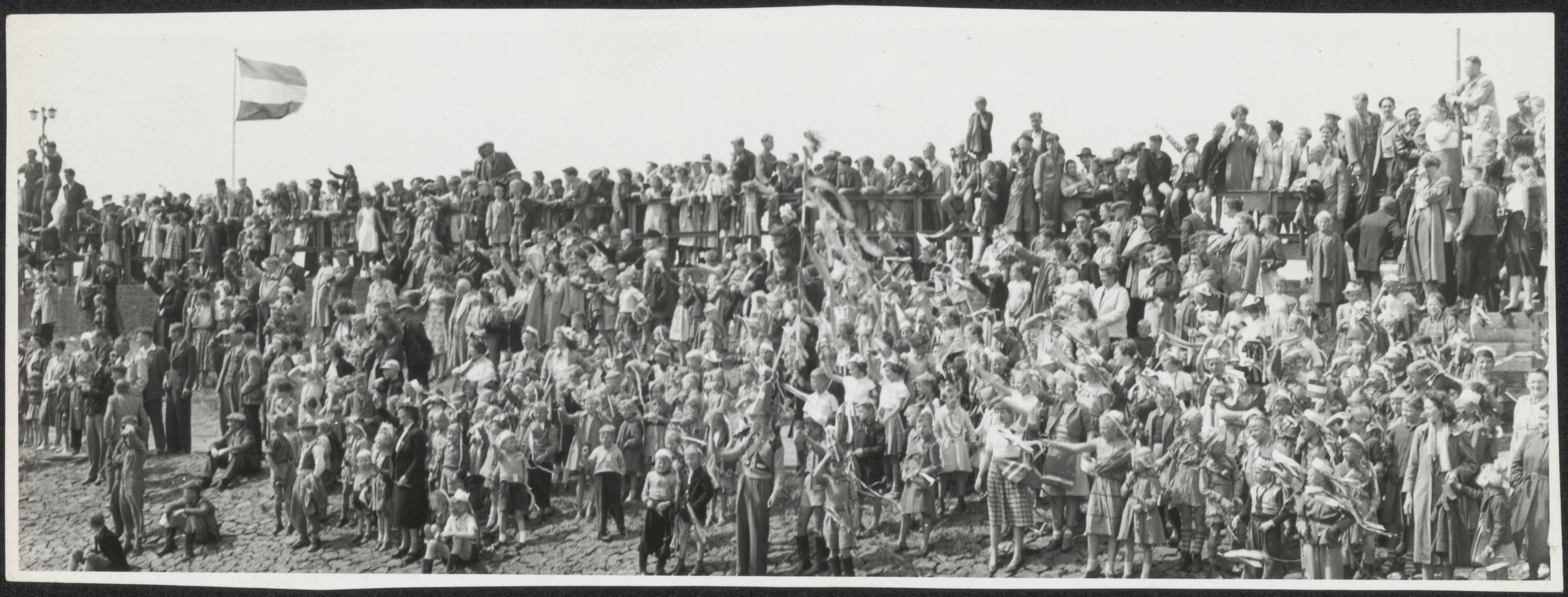 - Belangstellenden in Numansdorp bij het bezoek van koningin Juliana aan de Haringvlietbrug.