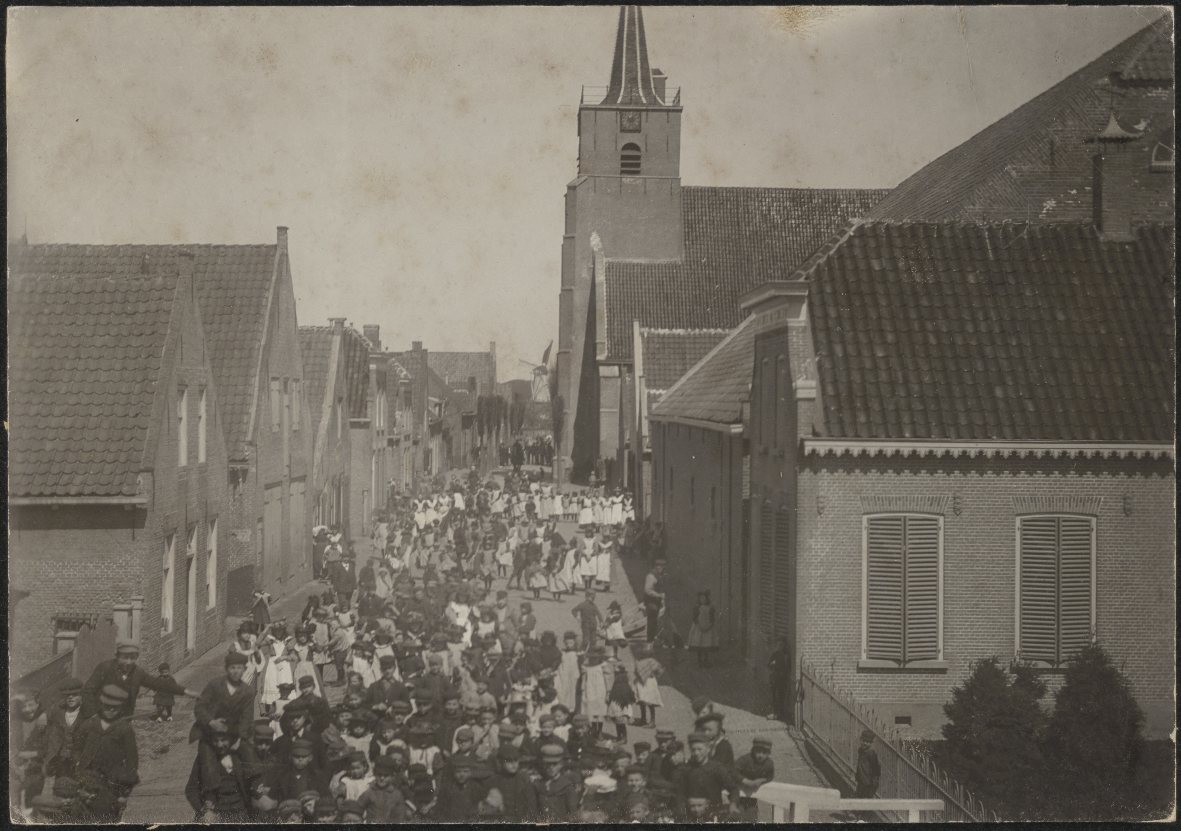 - Optocht van schoolkinderen bij het 25-jarig regeringsjubuleum van koningin Wilhelmina in de Torenstraat, gezien vanaf de Schuringsedijk richting de Kerk van de Hervormde Gemeente en molen Landzicht in Numansdorp.