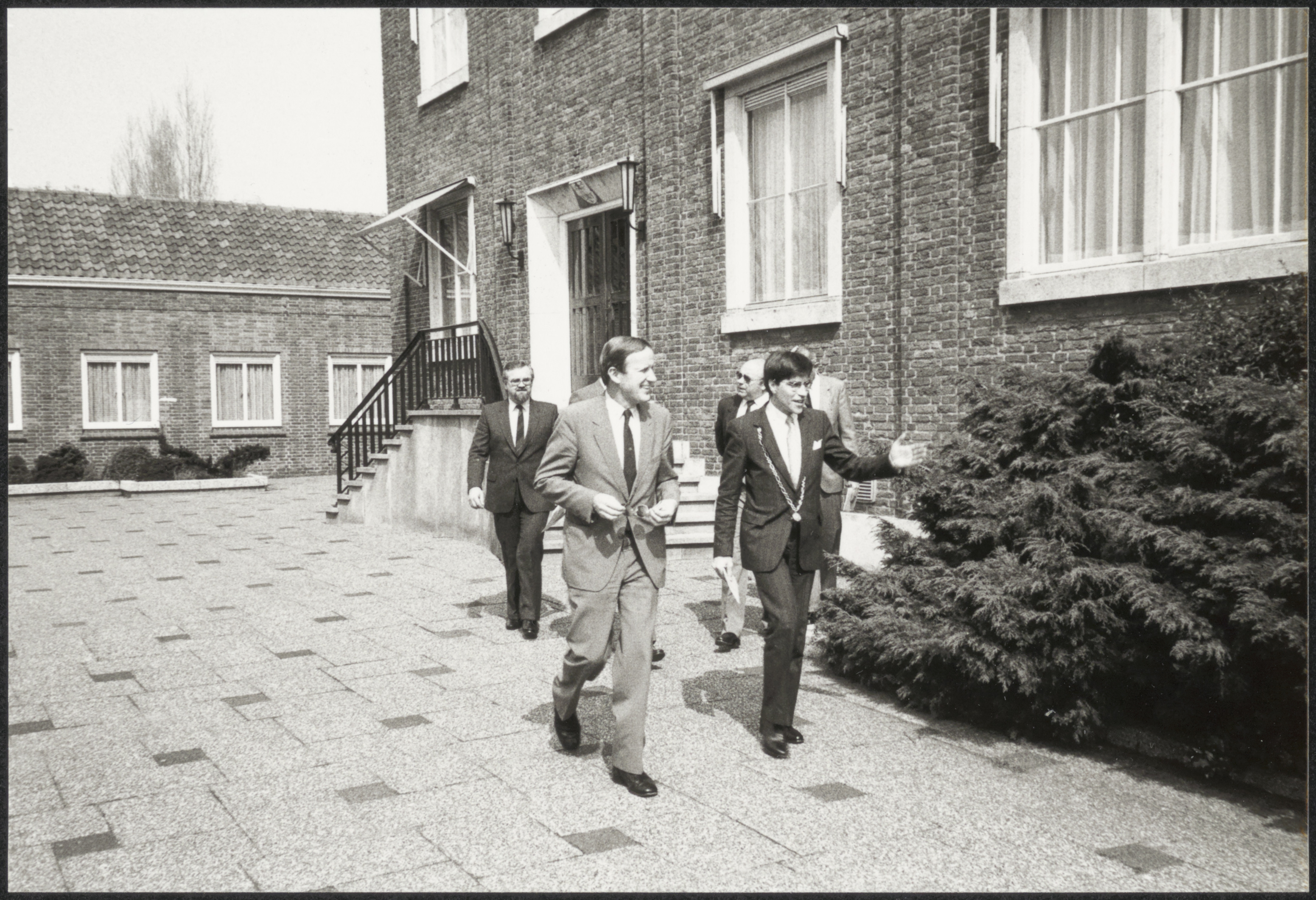- Burgemeester Bert (E.W.H.) Broekhuis (rechts) vergezelt Commissaris van de Koningin in Zuid-Holland dr. Schelto Patijn bij het gemeentehuis aan de Raadhuislaan in Numansdorp.