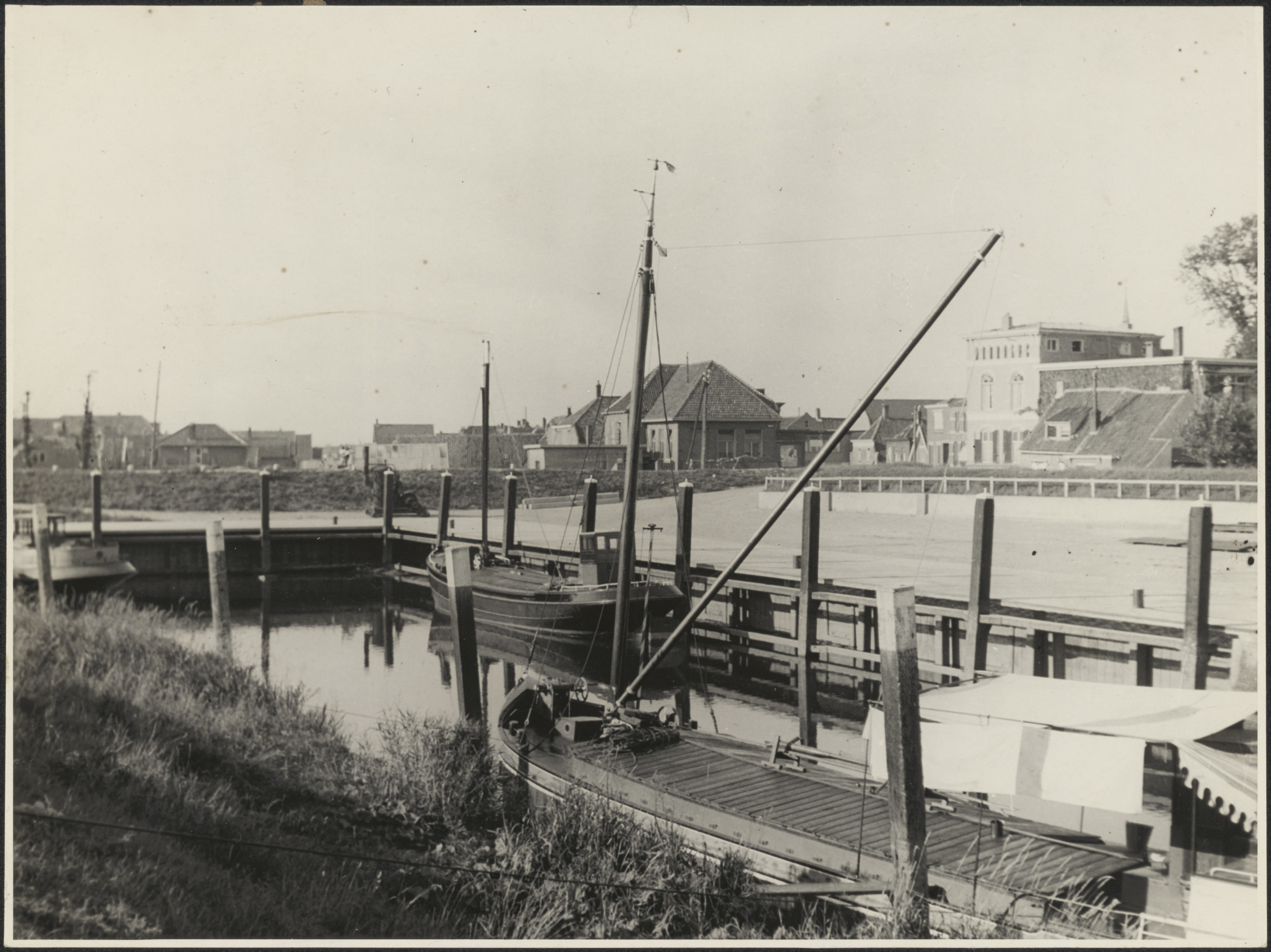 - Zicht op de Schuringsedijk met het Hoge Huys (rechts), gezien vanaf de Havenkade in Numansdorp.