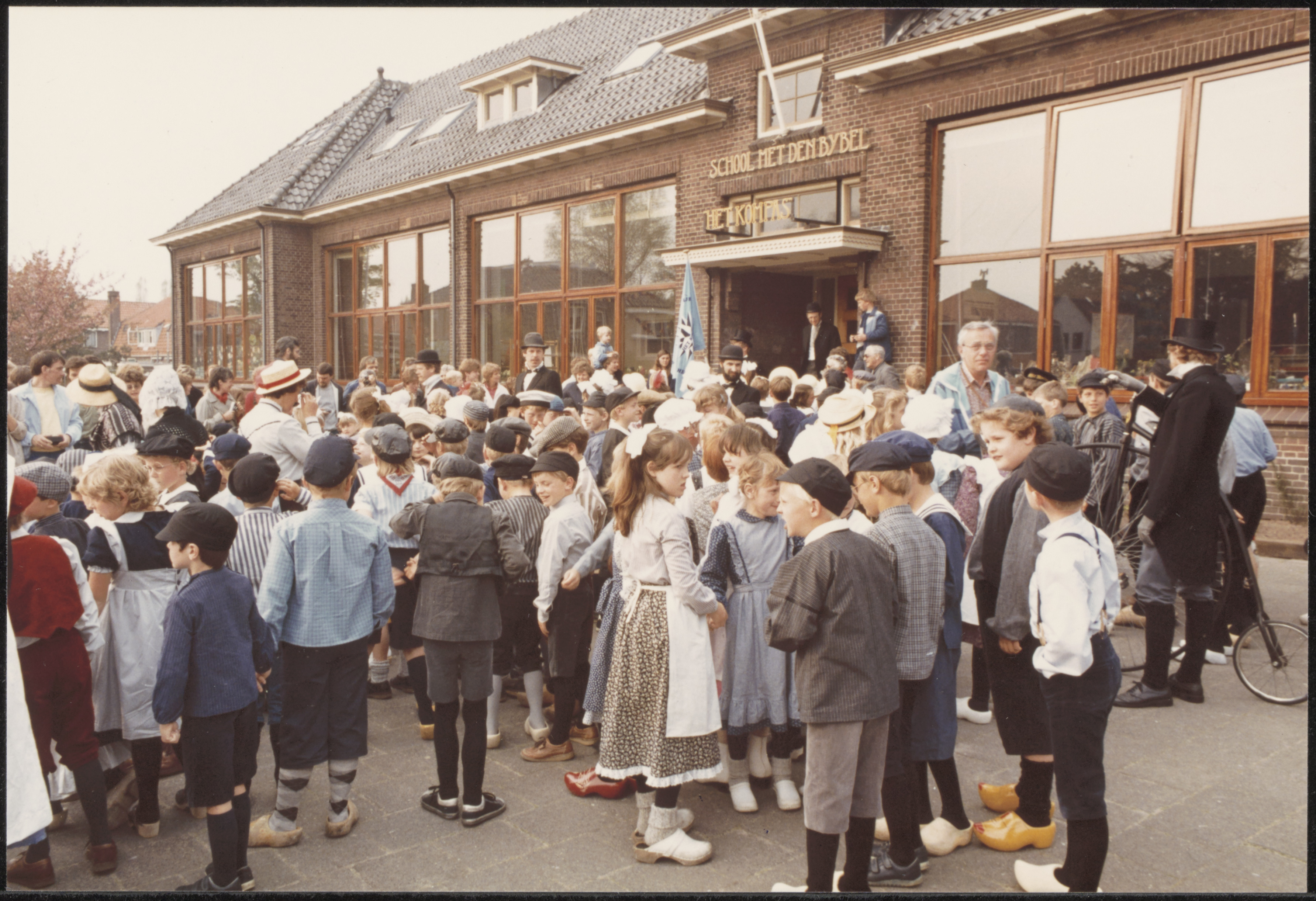 - Verklede kinderen bij de School met den Bijbel Het Kompas aan het Scheepsbouwplein in Alblasserdam.