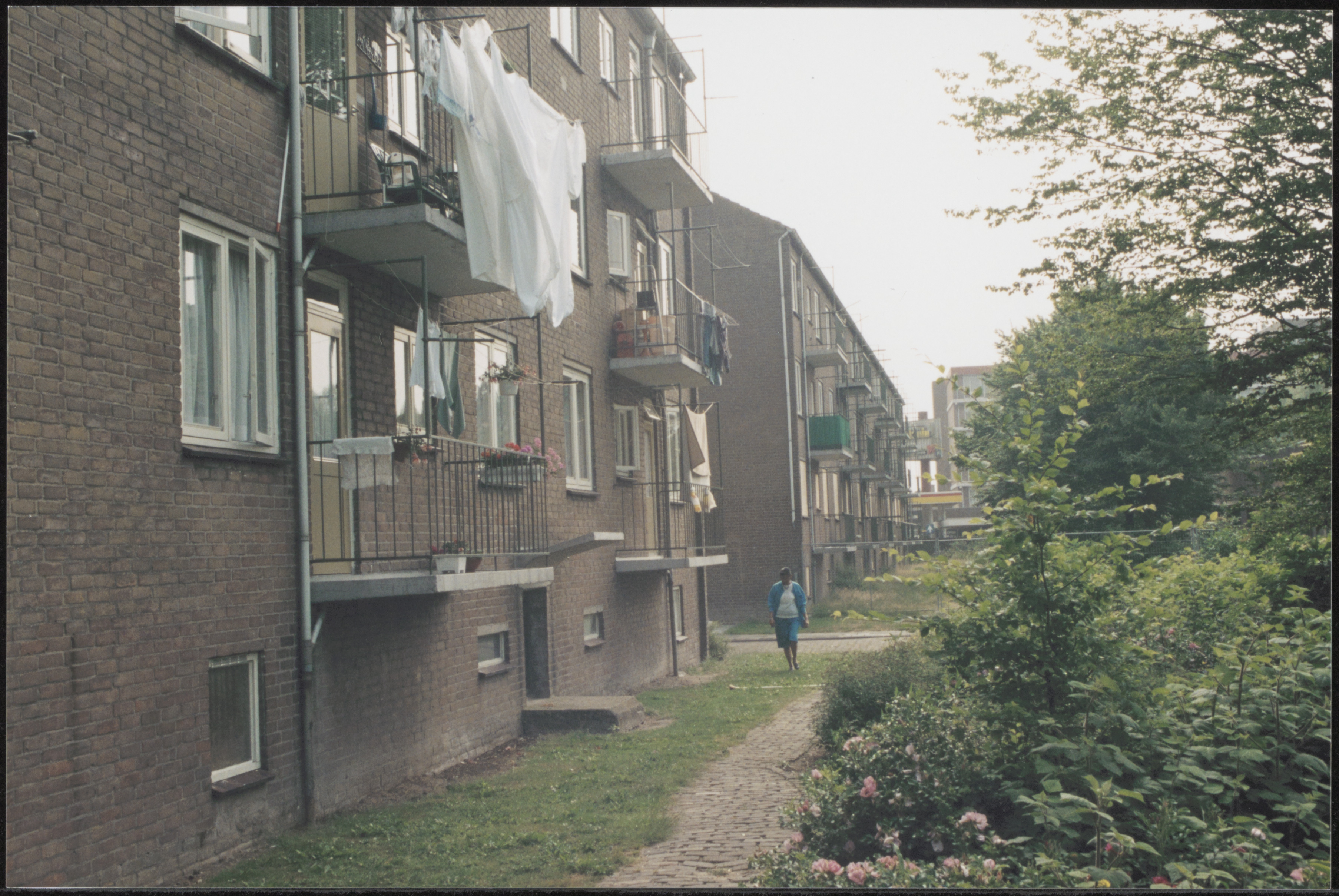 - Achterzijde van flats aan de Van Eesterensingel gezien vanaf de Rozenstraat richting Wilgenplein in Alblasserdam.