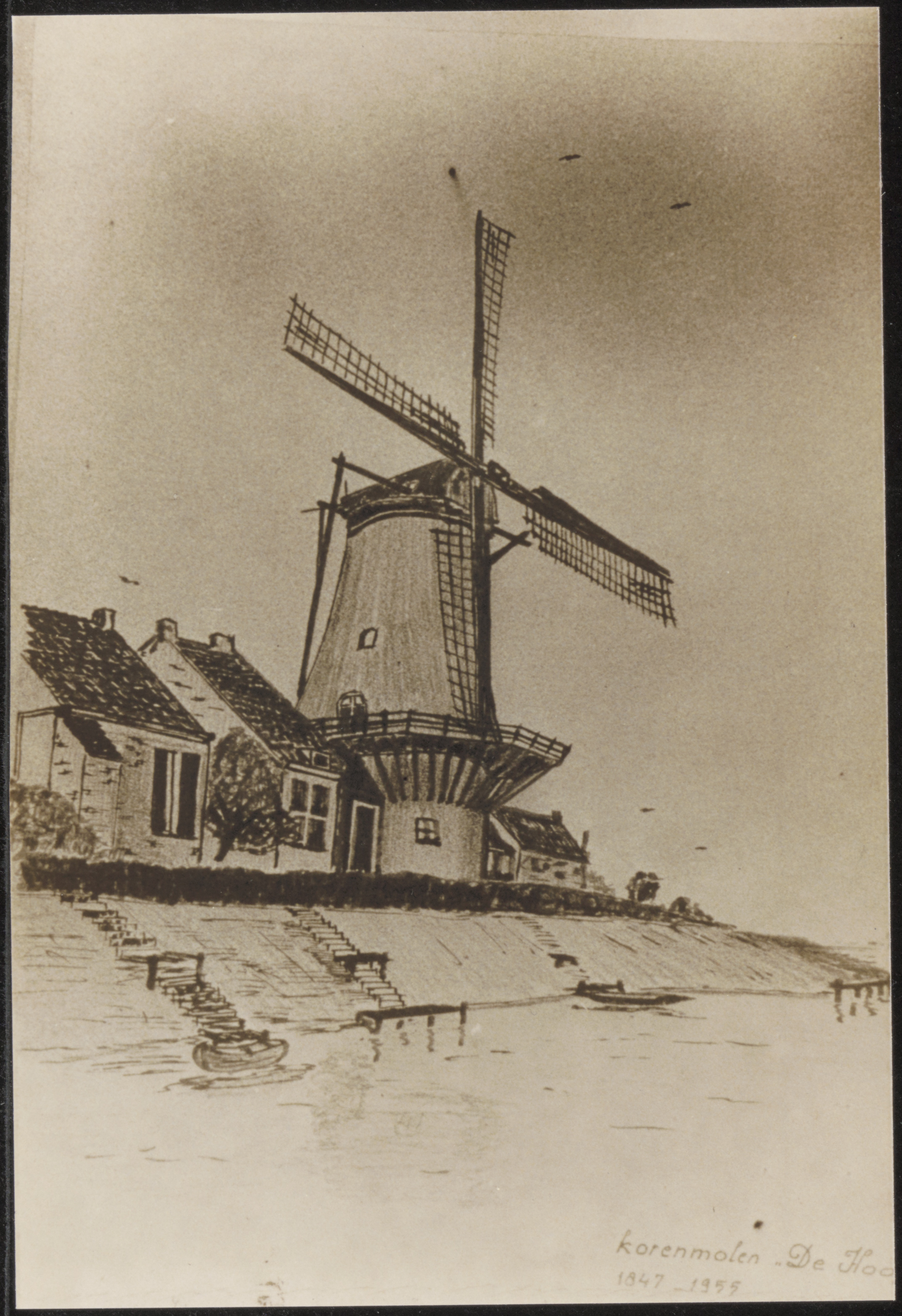Pentekening van molen De Hoop aan het Zuiderstek in Alblasserdam.
