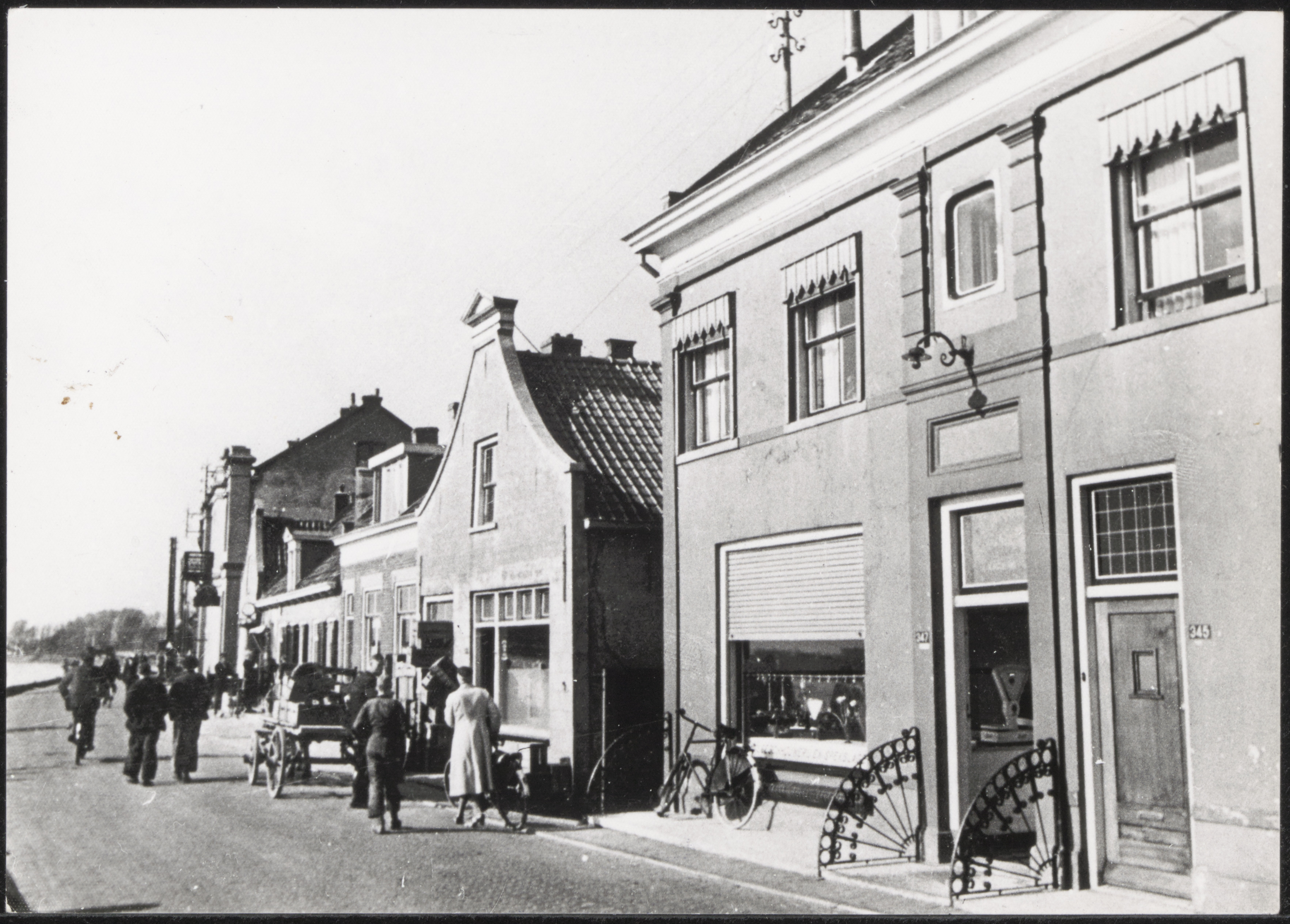 - West Kinderdijk in Alblasserdam. Vooraan bakker Van Nugteren, daarnaast slagerij Jan Rietkerk en vervolgens groentehandelaar Dirk Louter.