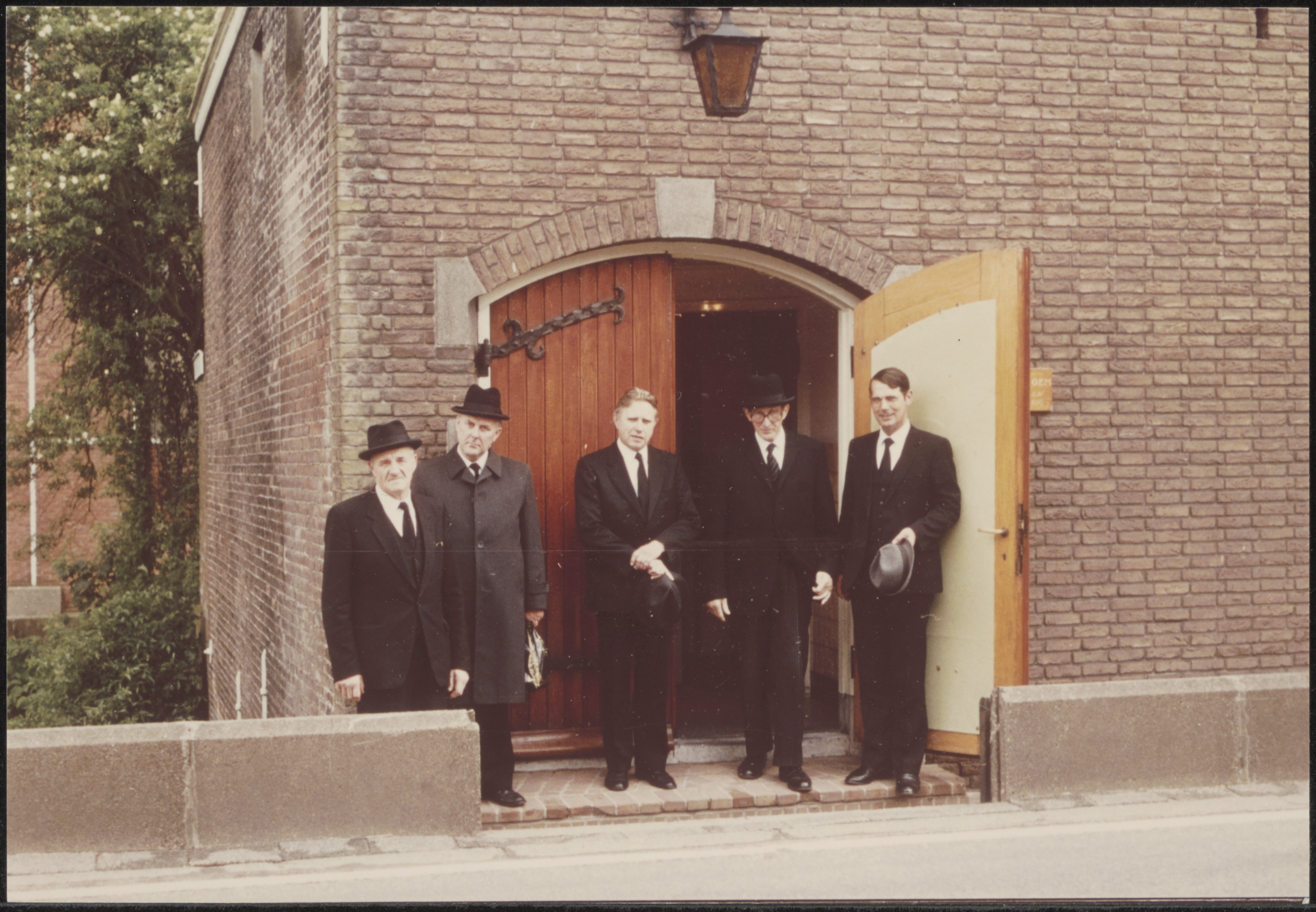 Ouderlingen van de Oud Gereformeerde Gemeente aan de West Kinderdijk in Alblasserdam.