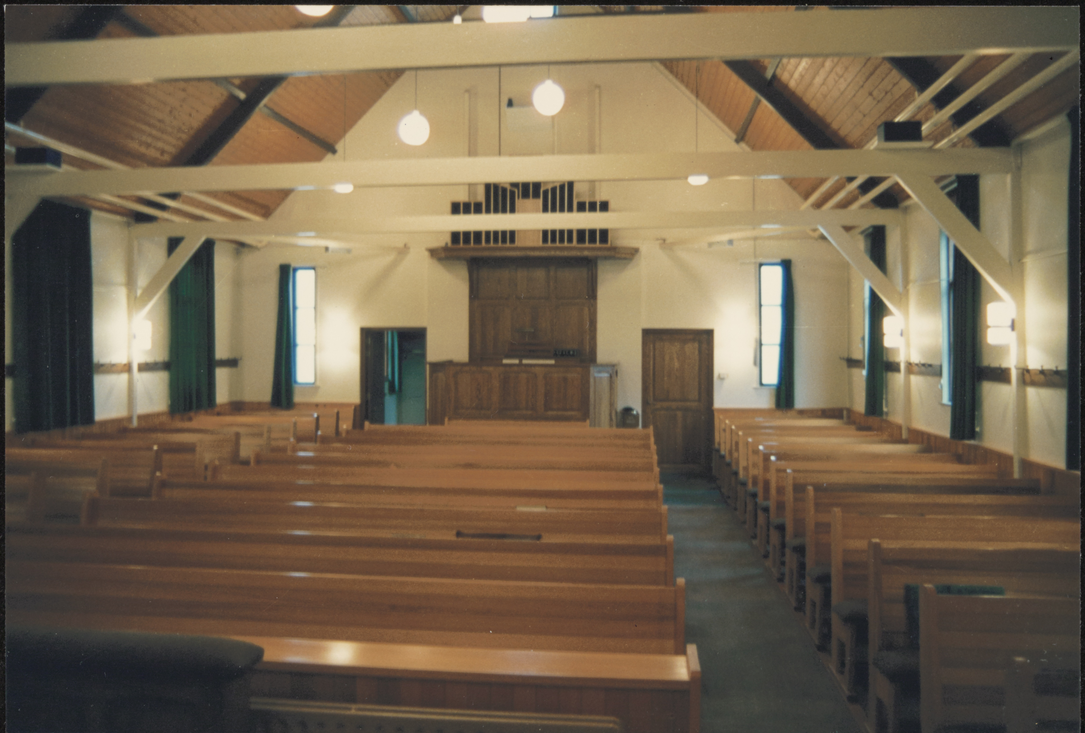 Interieur van de Hersteld Hervormde Kerk (bekend als het schuurtje) aan de Merwedeweg …