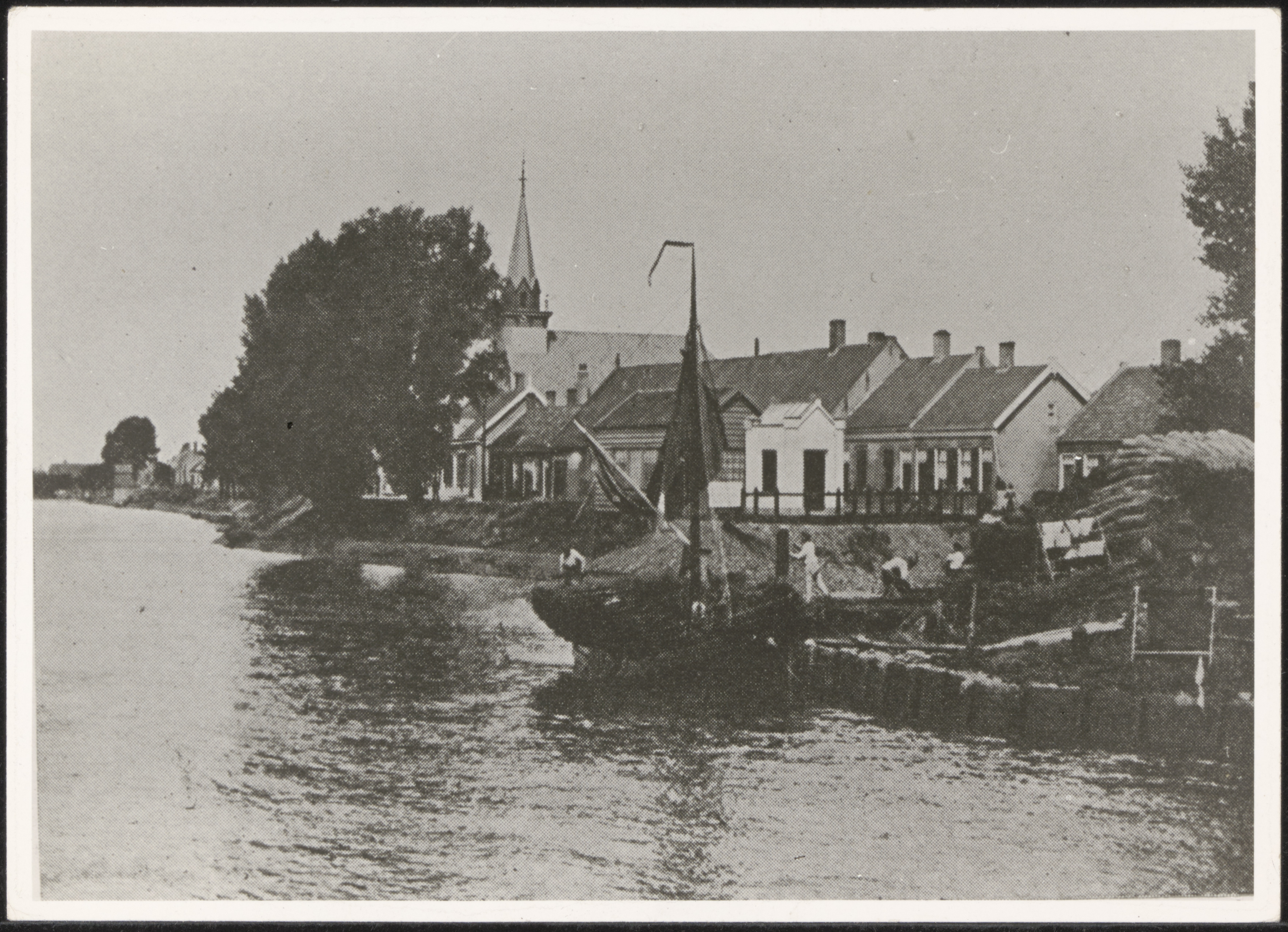 - Het zogenaamde Melkhoofdje aan de Oost Kinderdijk in Alblasserdam.Hiervandaan ging het melktransport van de melkbussen uit de Alblasserwaard naar de fabriek in Rotterdem. Rechts is een opslag van rijshout. Op de achtergrond de Gereformeerde Kerk.
