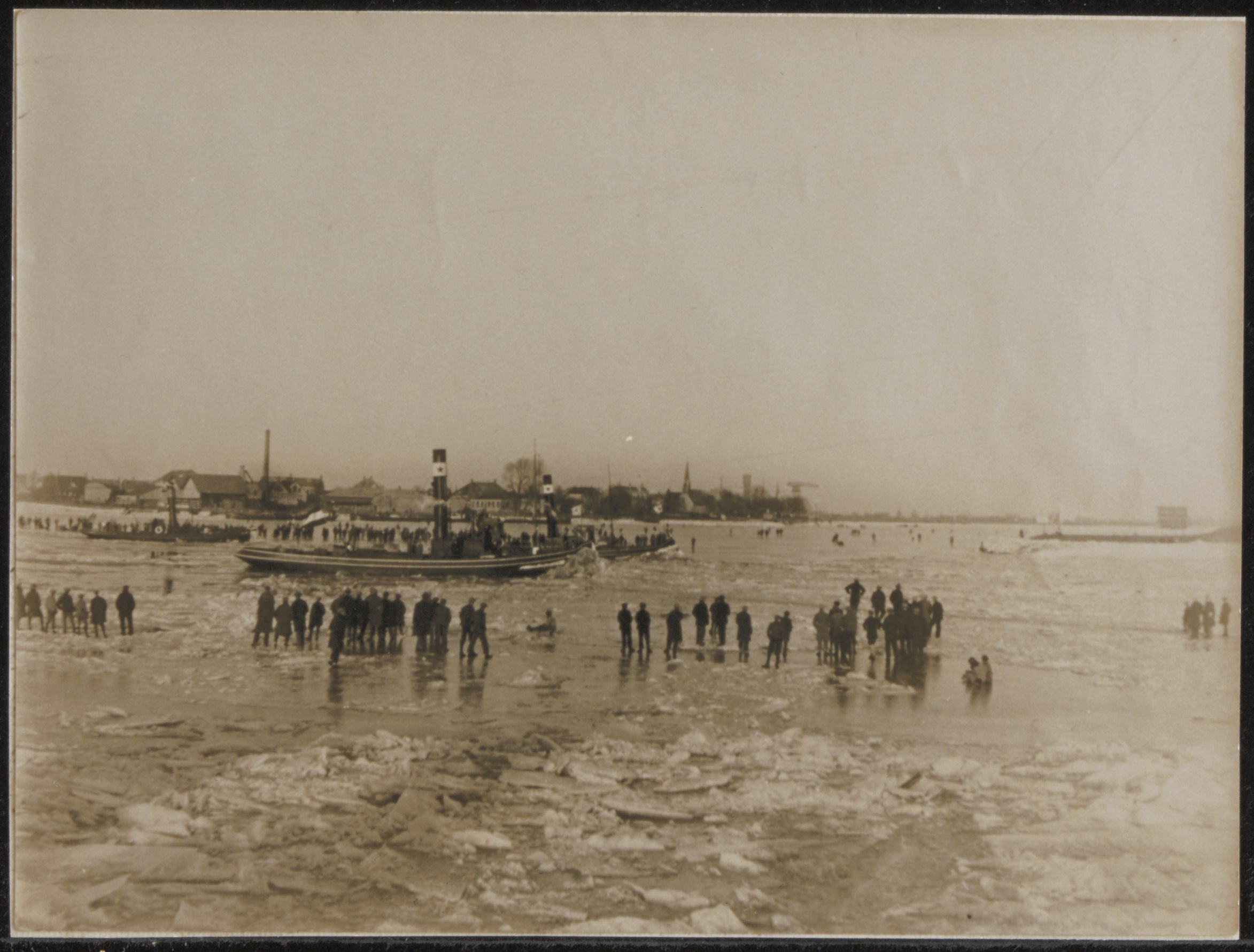 IJsbrekers in actie hier op de kruising van de Noord en de lek, met krimpen a/d Lek op de achtergrond. (1929?)