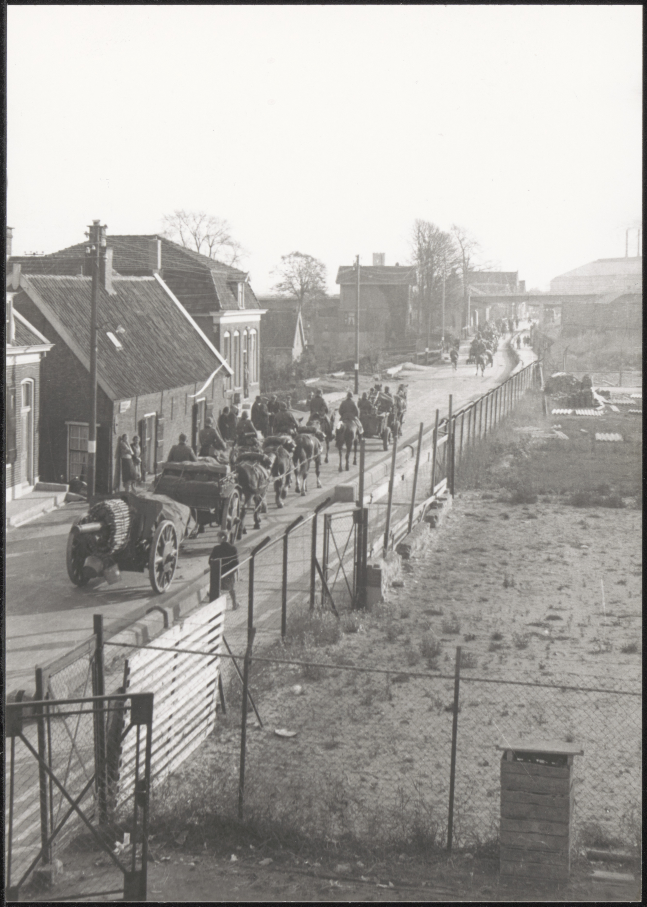 - Duitse militairen trekken weg over de Ruigenhil bij scheepswerf De Noord in Alblasserdam.