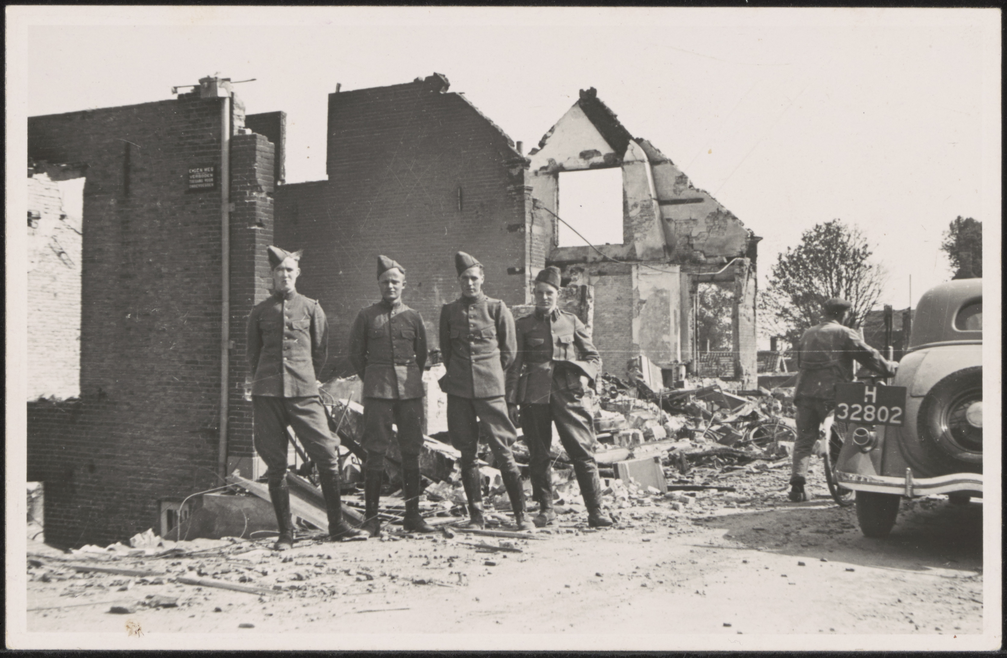 - Hollandse militairen na de capitulatie op de Ruigenhil voor de uitgebrande winkel van Van Dijk met ernaast het dubbele woonhuis van J. Otto en C.Vogelenzang.