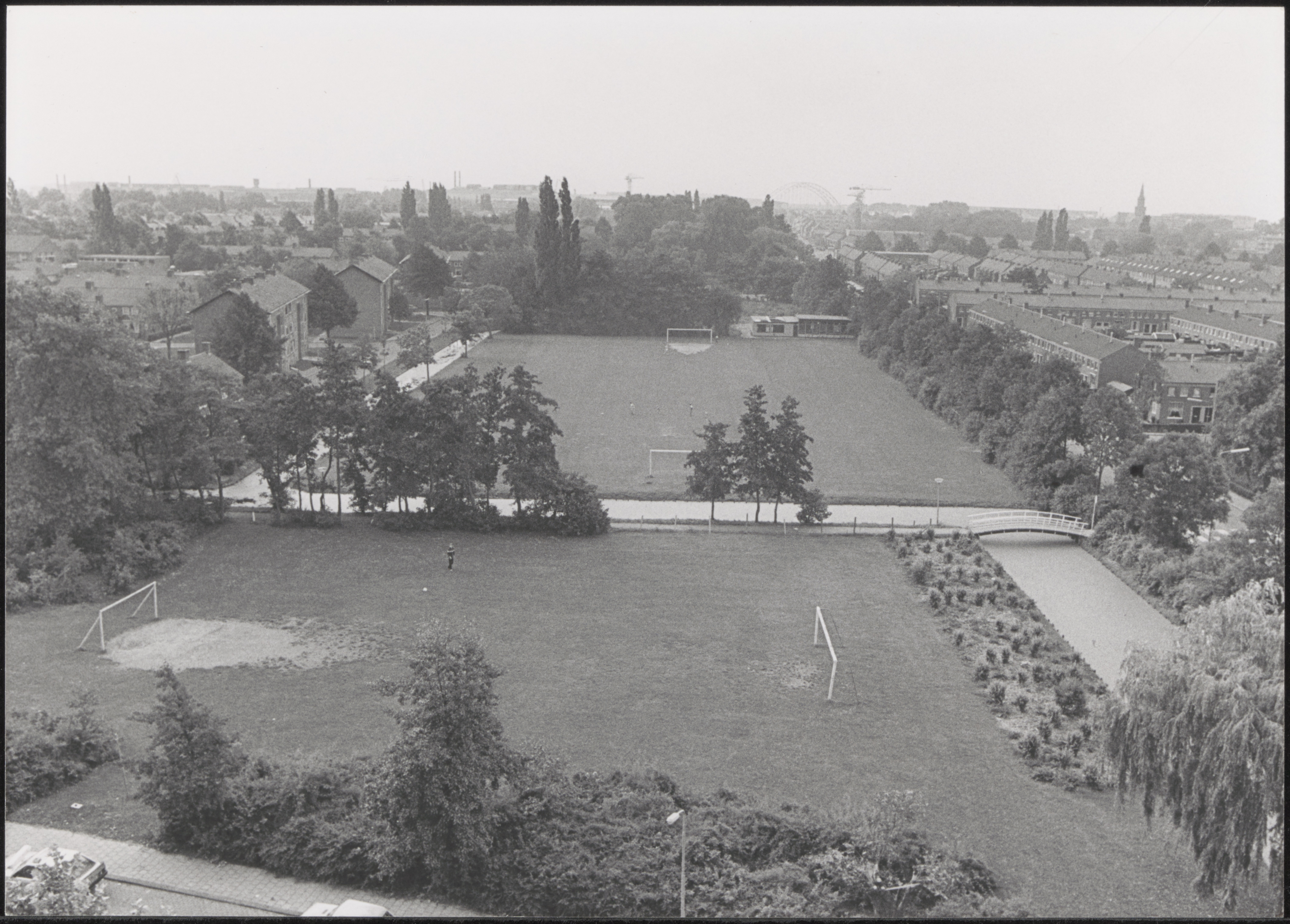 - Voetbalvelden tussen de Wilhelminaweg (links) en de Plantageweg (rechts) in Alblasserdam, gezien vanaf de Nicolaas Beetsstraat