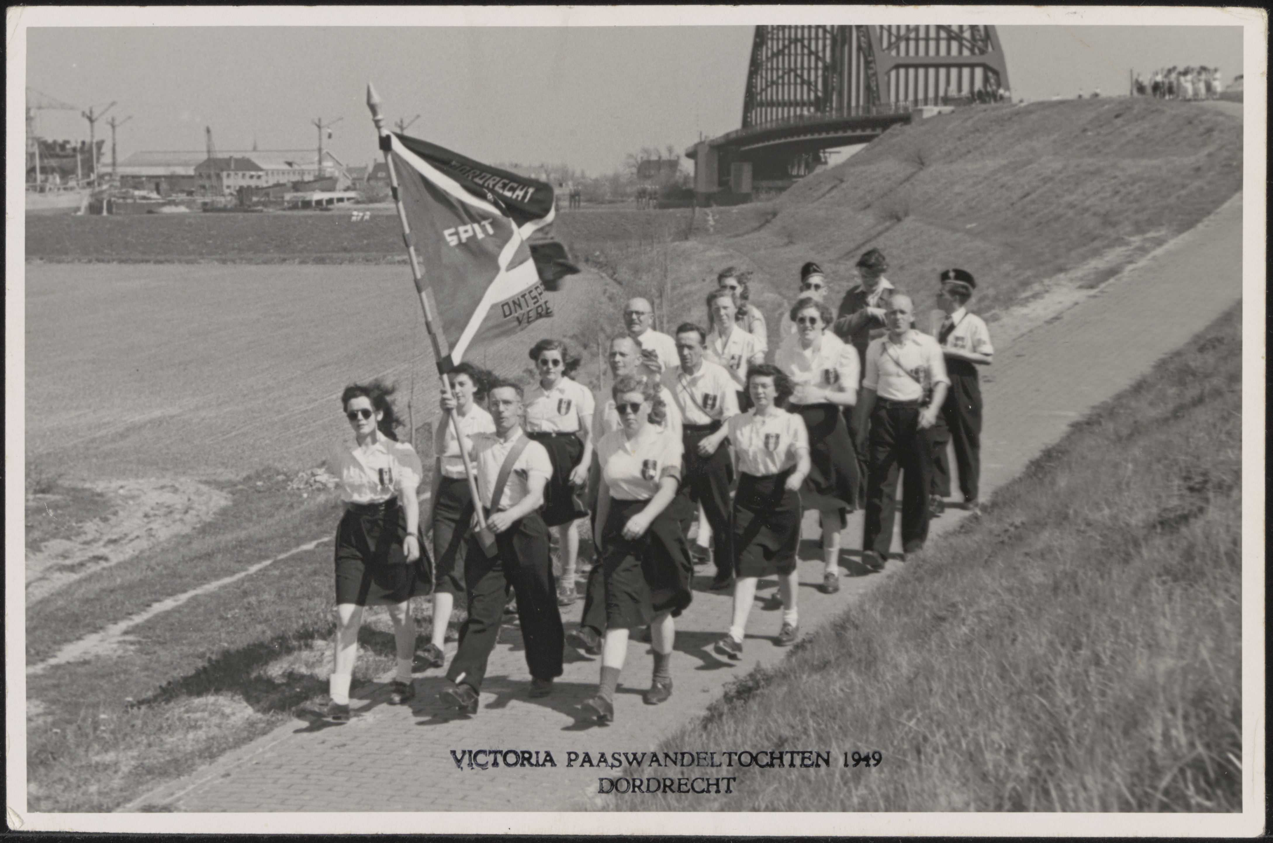 - Deelnemers aan de paaswandeltocht op de afrit van de Brug over de Noord in Hendrik-Ido-Ambacht.:Links scheepswerf Smit in Alblasserdam