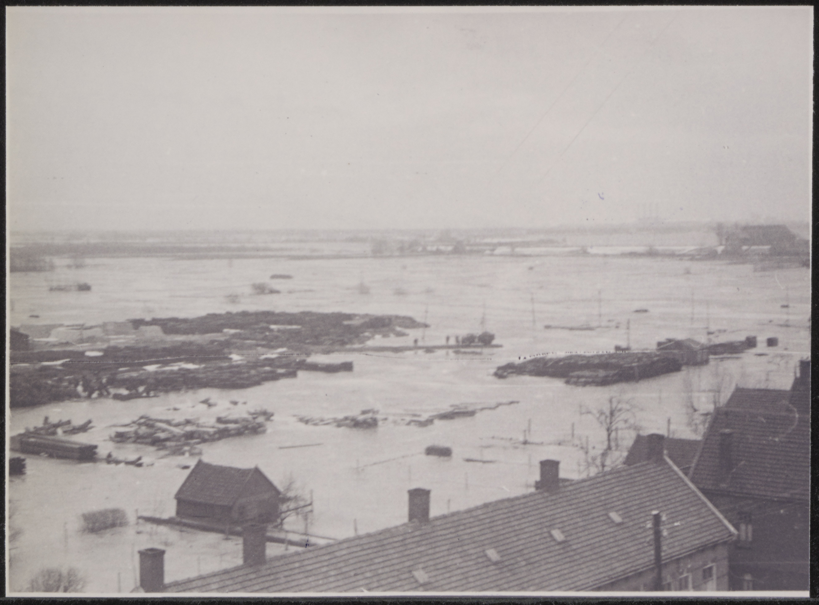 - Op de voorgrond woningen aan de Ruigenhil tijdens de watersnood in Alblasserdam, gezien naar het zuiden.