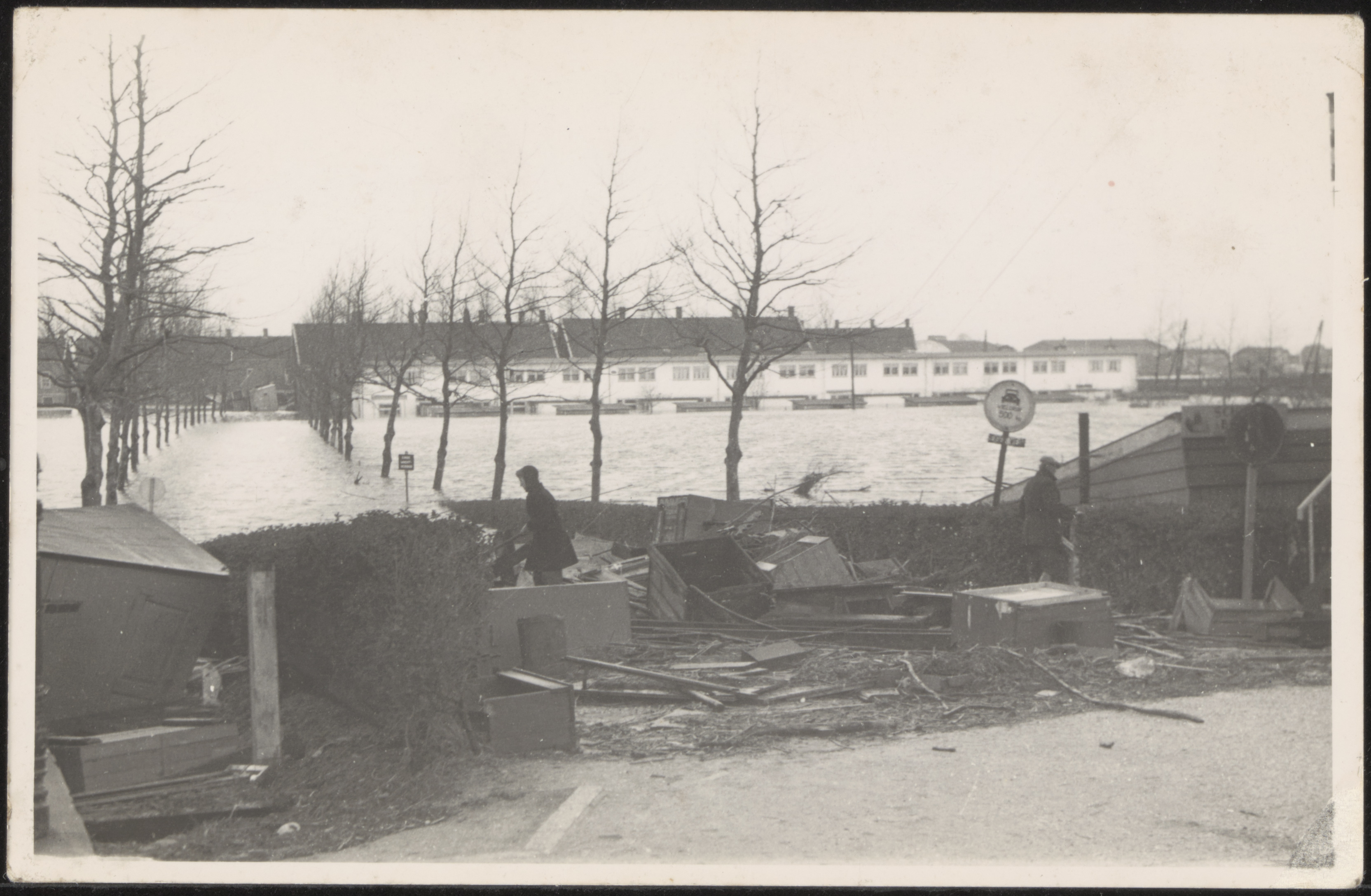 - Woningen aan de Lekkade in Kinderdijk, gezien vanaf de Molenstraat tijdens de watersnood.