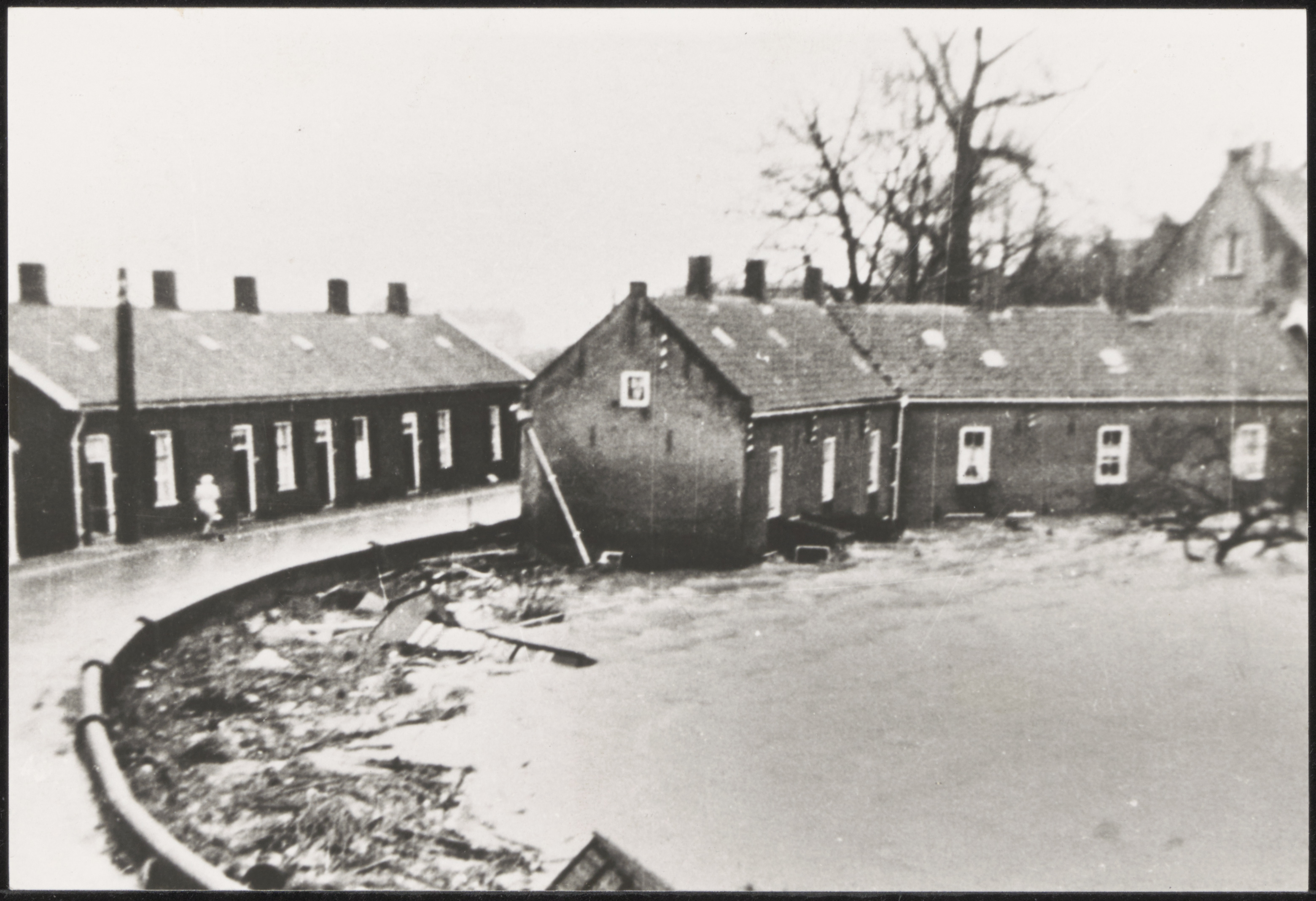 Molenstraat 60/68 tijdens de watersnood van 1953 in Kinderdijk.