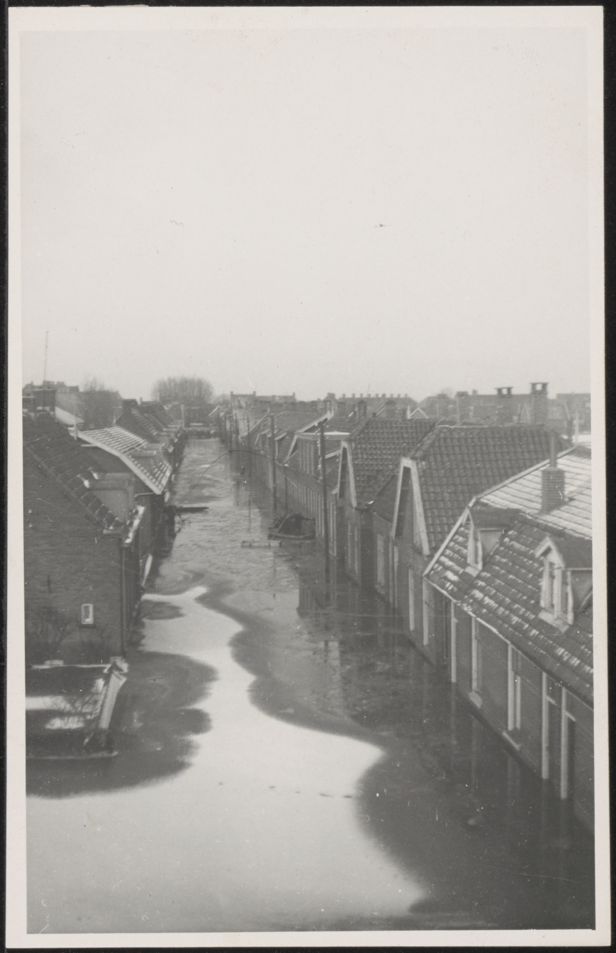Oranjestraat in Alblasserdam tijdens de watersnood gezien vanaf de oprit van de Brug …