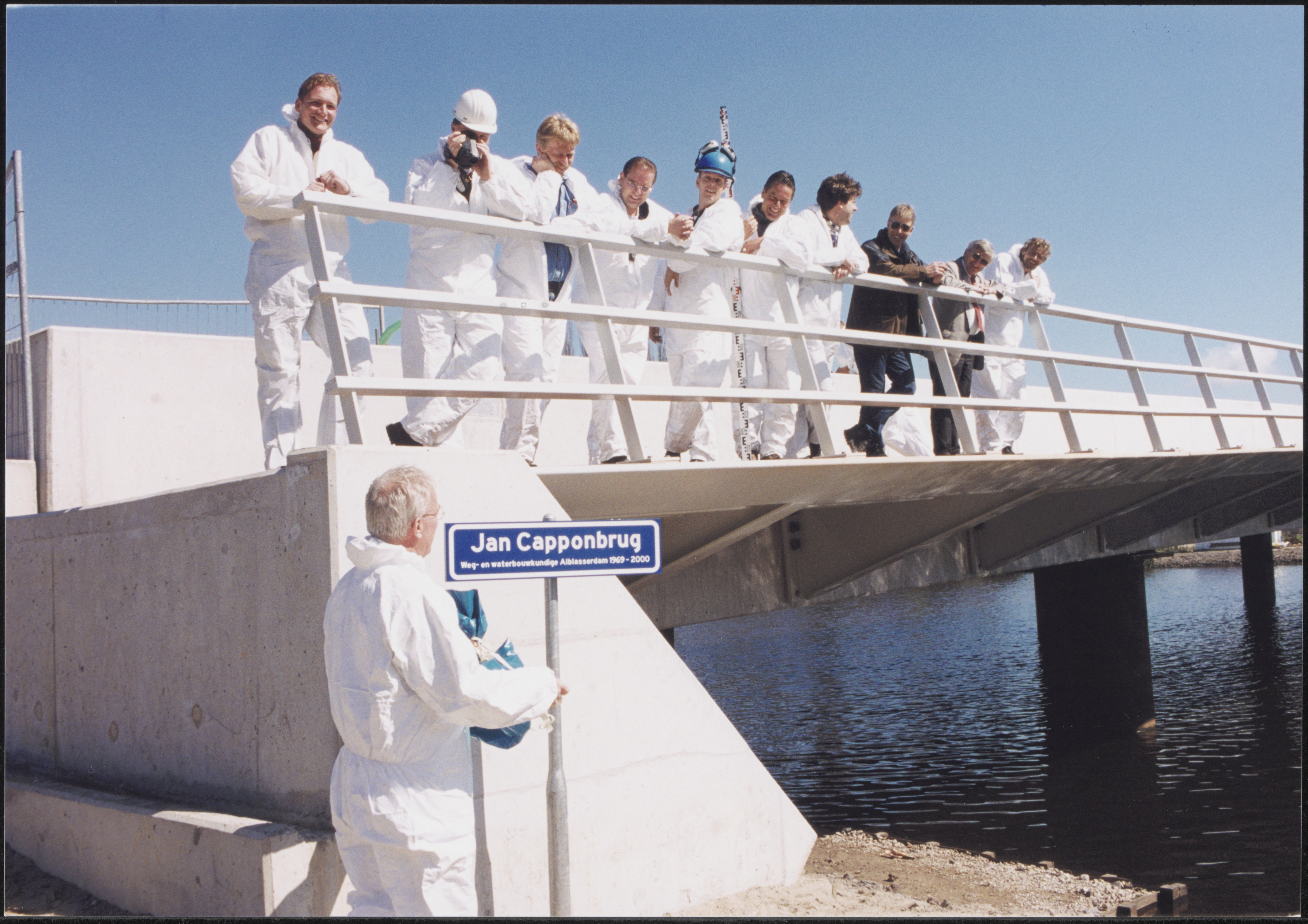- Bouw van de Oude Torenbrug over de Alblas in het verlengde van de Randweg in Alblasserdam. Het straatnaambord is een verzinsel van de bouwers.