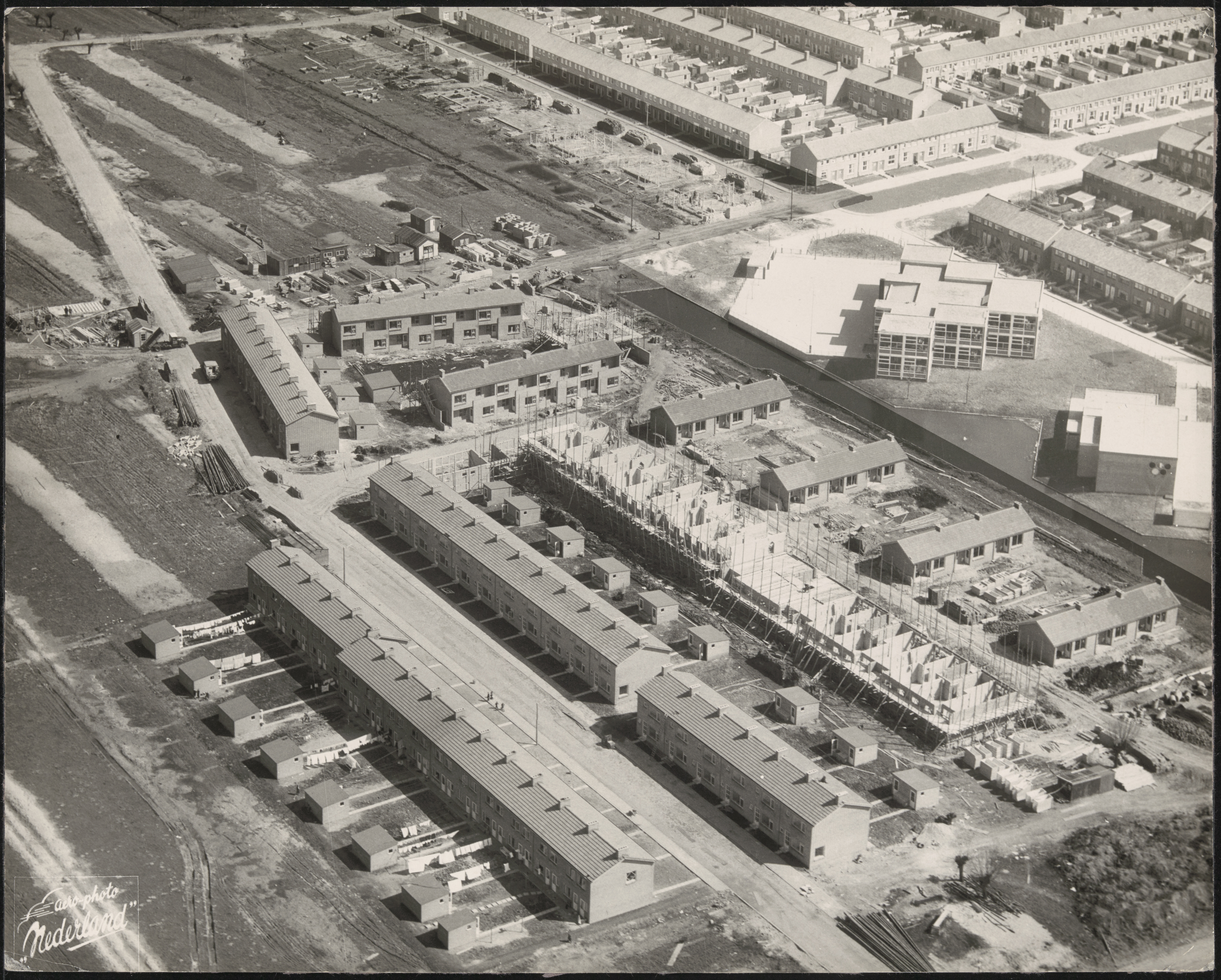 Luchtfoto Alblasserdam met midden onder naar links boven de Korenbloemstraat. Rechts boven naar links Randweg overgaand in Paralelweg. Links boven Lindelaan. Rechts onder van Eesterensingel 1955.
