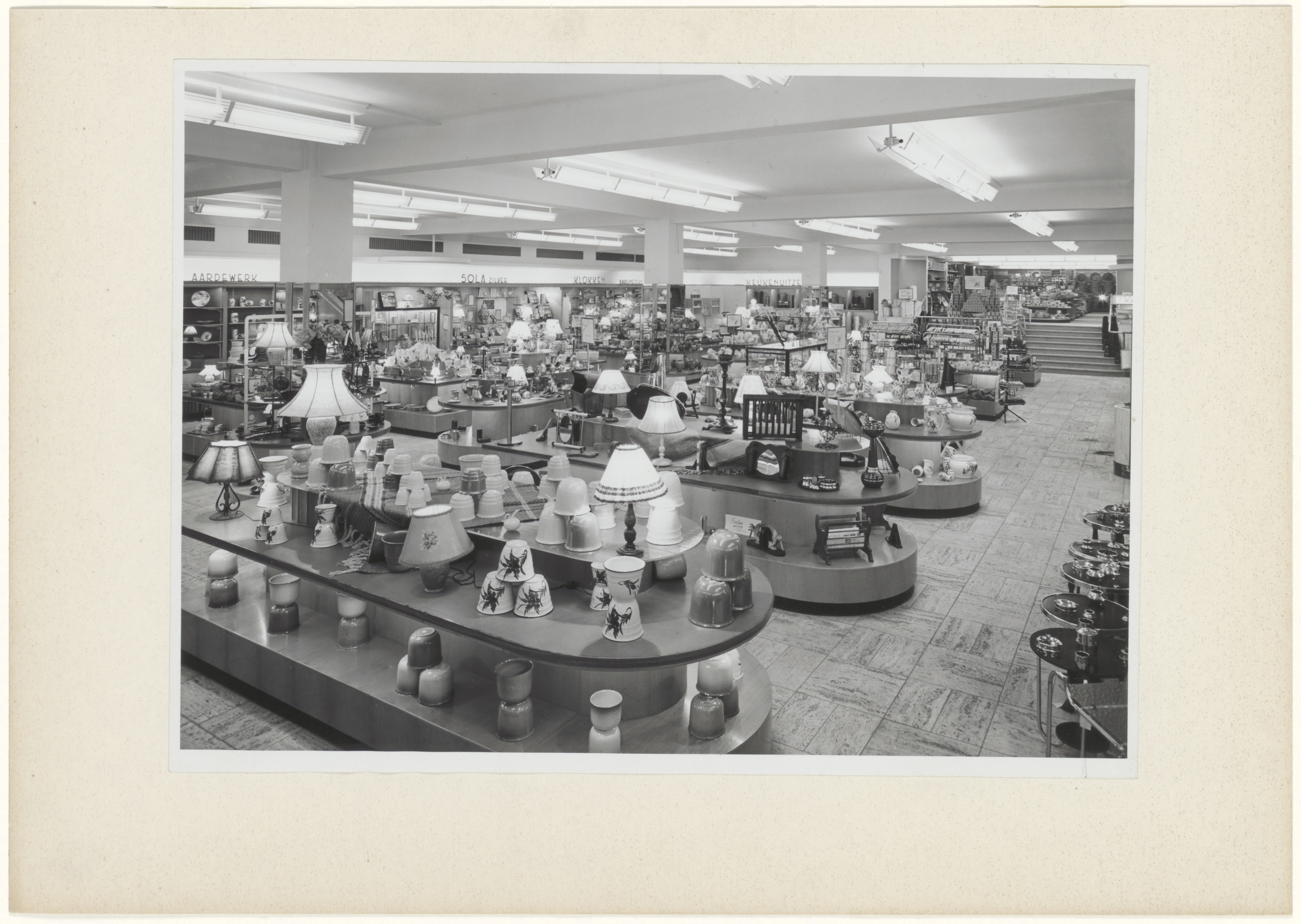 Interieur, aardewerk en glaswerkafdeling van de Vroom en Dreesmann.