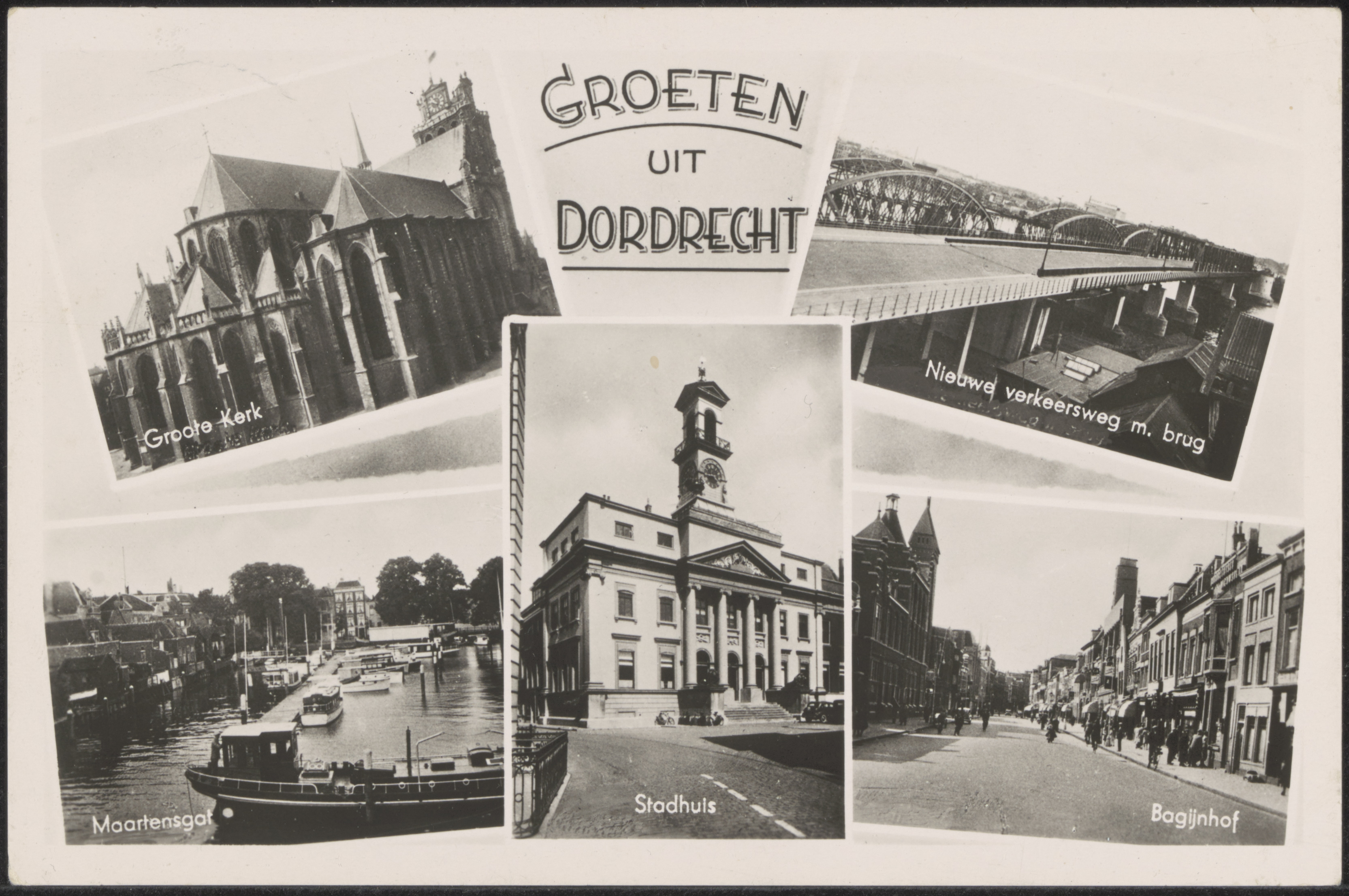 LB: Grote Kerk. M: Stadhuis. RB: Verkeers en spoorbrug richting Dordrecht. LO: Maartensgat. RO: Bagijnhof met links postkantoor.
