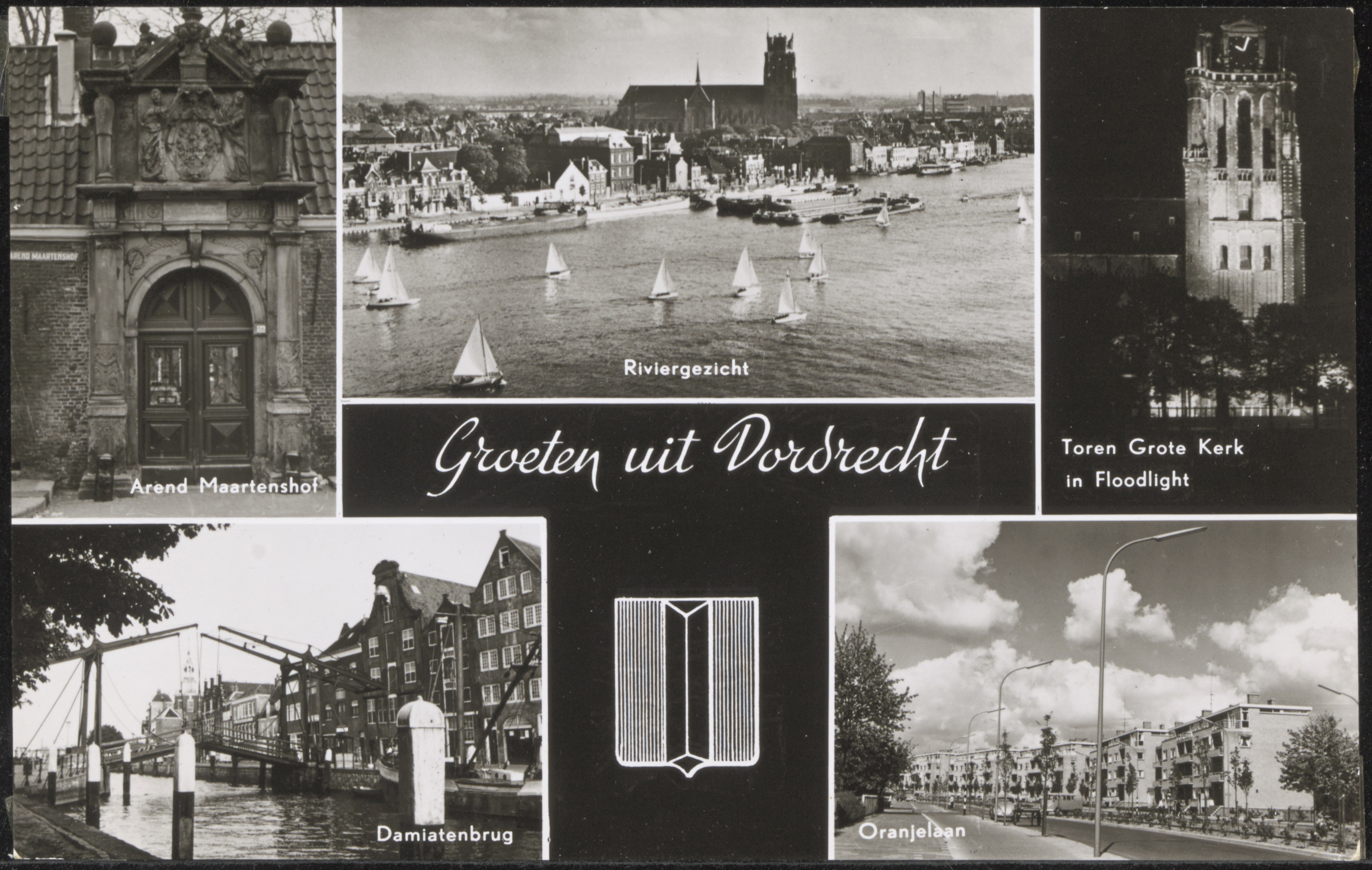 LB: Toeg.poort Arend Maartenshof. MB: Riviergezicht met Grote Kerk. RB: Grote Kerk. LO: Damiatebrug. RO: Oranjelaan.