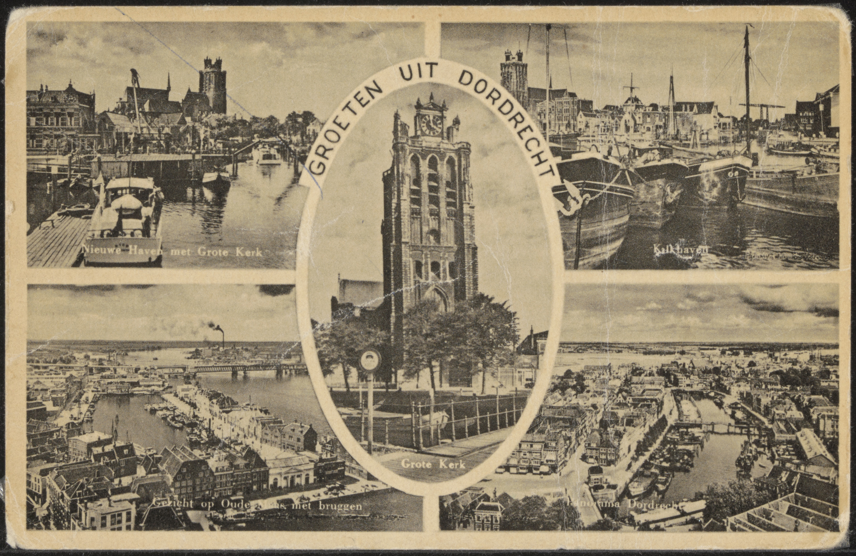 LB: Nieuwe Haven met Grote Kerk. M.: Grote Kerk. RB: Kalkhaven met Spuibrug.