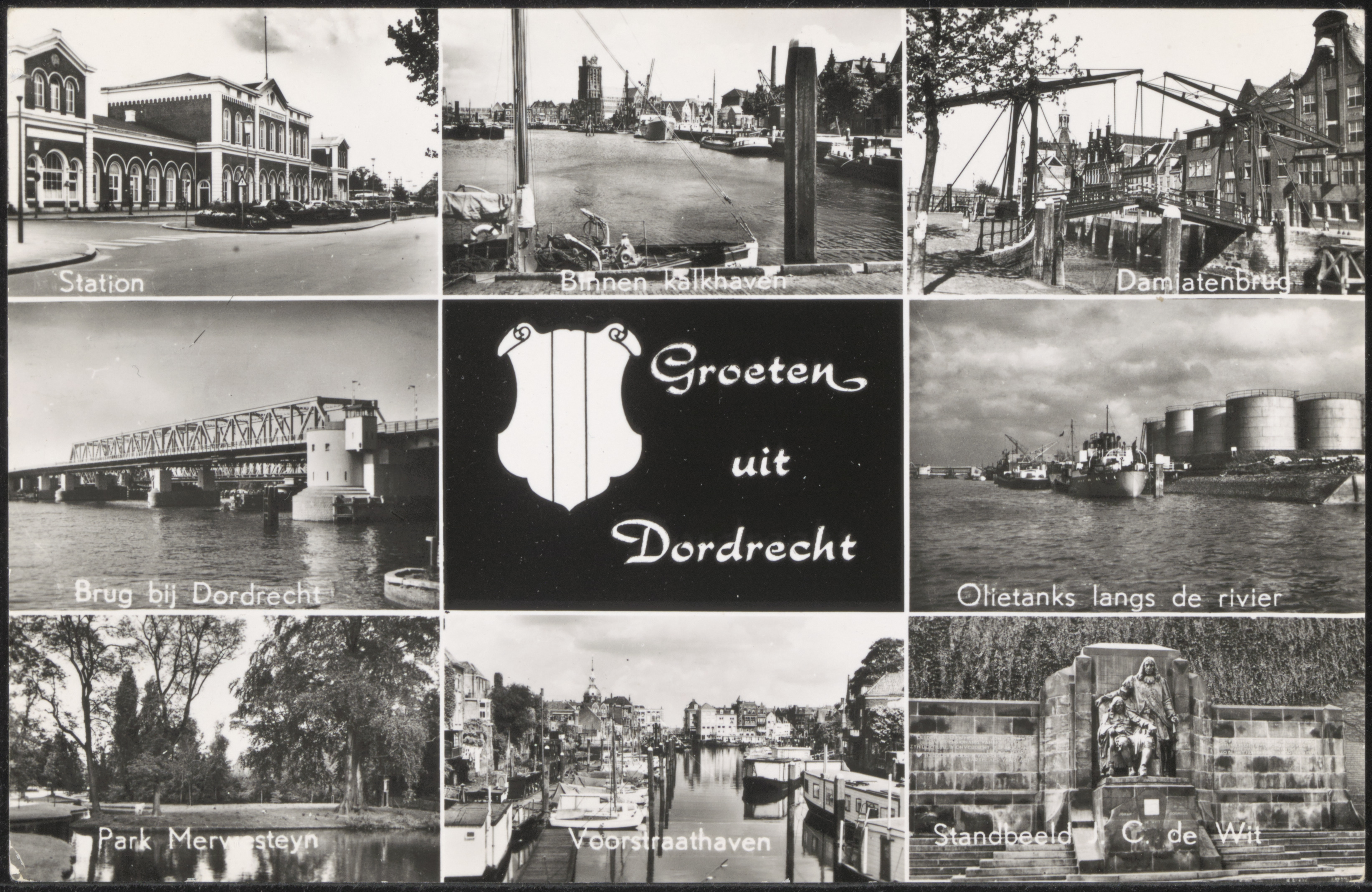 LB: Station. M: Kalkhaven met Grote Kerk. RB: Damiatebrug. ML: Verkeers en spoorbrug over Oude Maas. MR: Vanaf de Kil olietanks van Gebr. Broere. LO: Park Merwestein. MO: Voorstraatshaven. RO: Standbeeld Johan en Cornelis de Witt op de Visbrug.