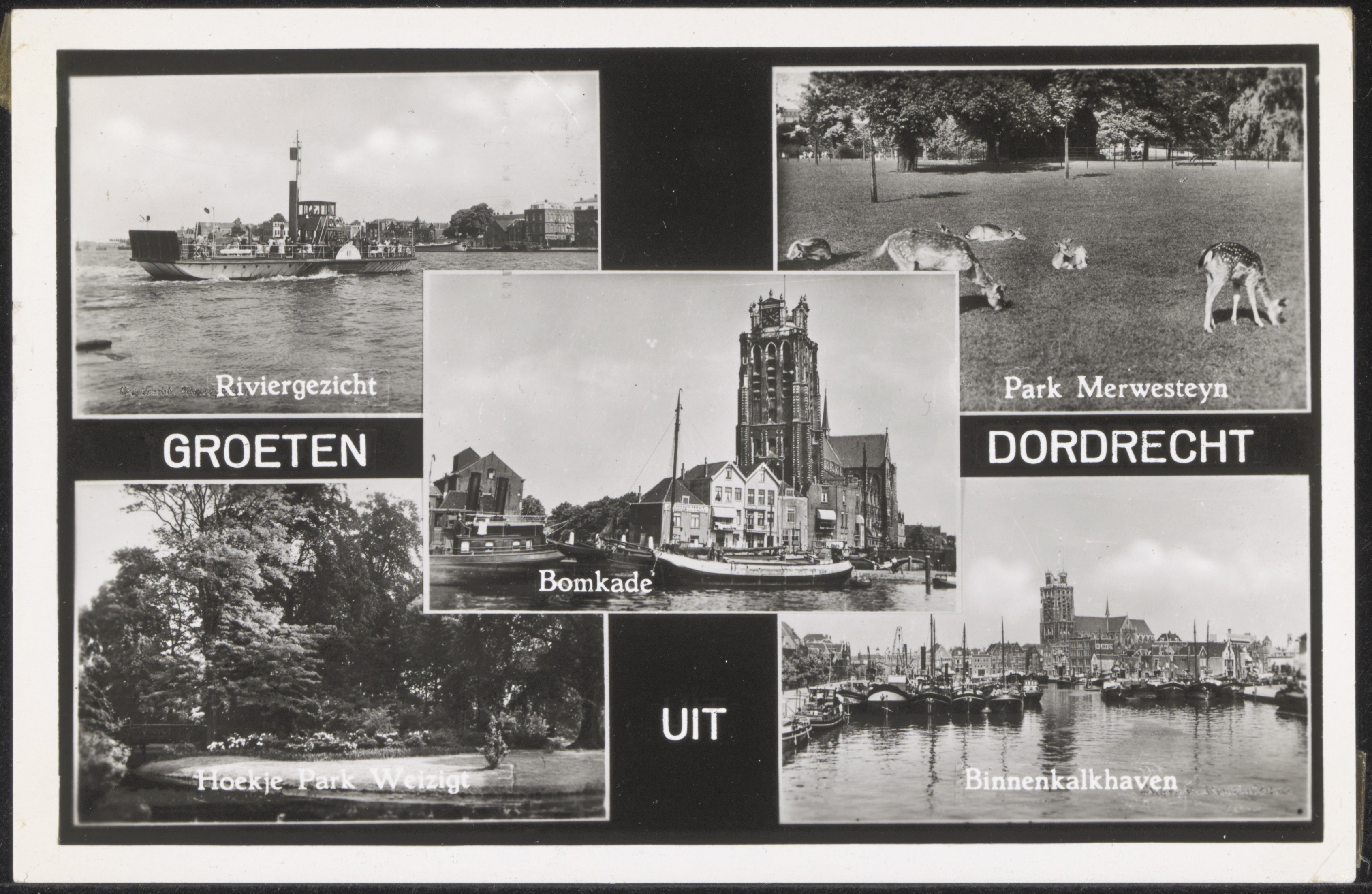 LB: Veer Dordrecht-Zwijndrecht. M: Bomkade met Grote Kerk. RB: Hertenkamp Park Merwestein. LO: Park Weizigt. RO: Kalkhaven met Grote Kerk.