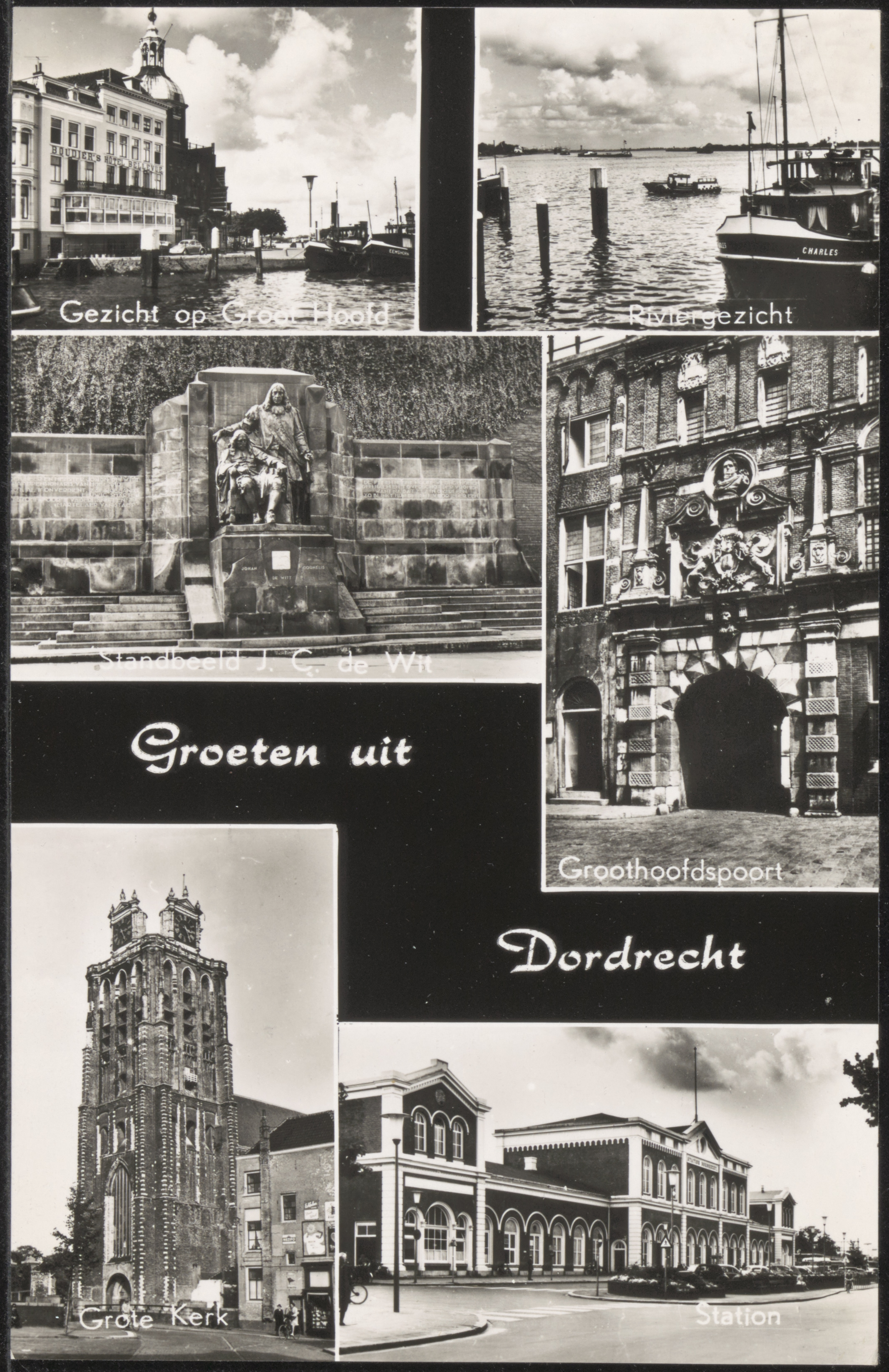 LB: Groothoofd. RB: Gezicht op Oude Maas. ML: Standbeeld Johan en Cornelis de Witt op de Visbrug. MR: Groothoofdspoort. LO: Grote Kerk. RO: Station.