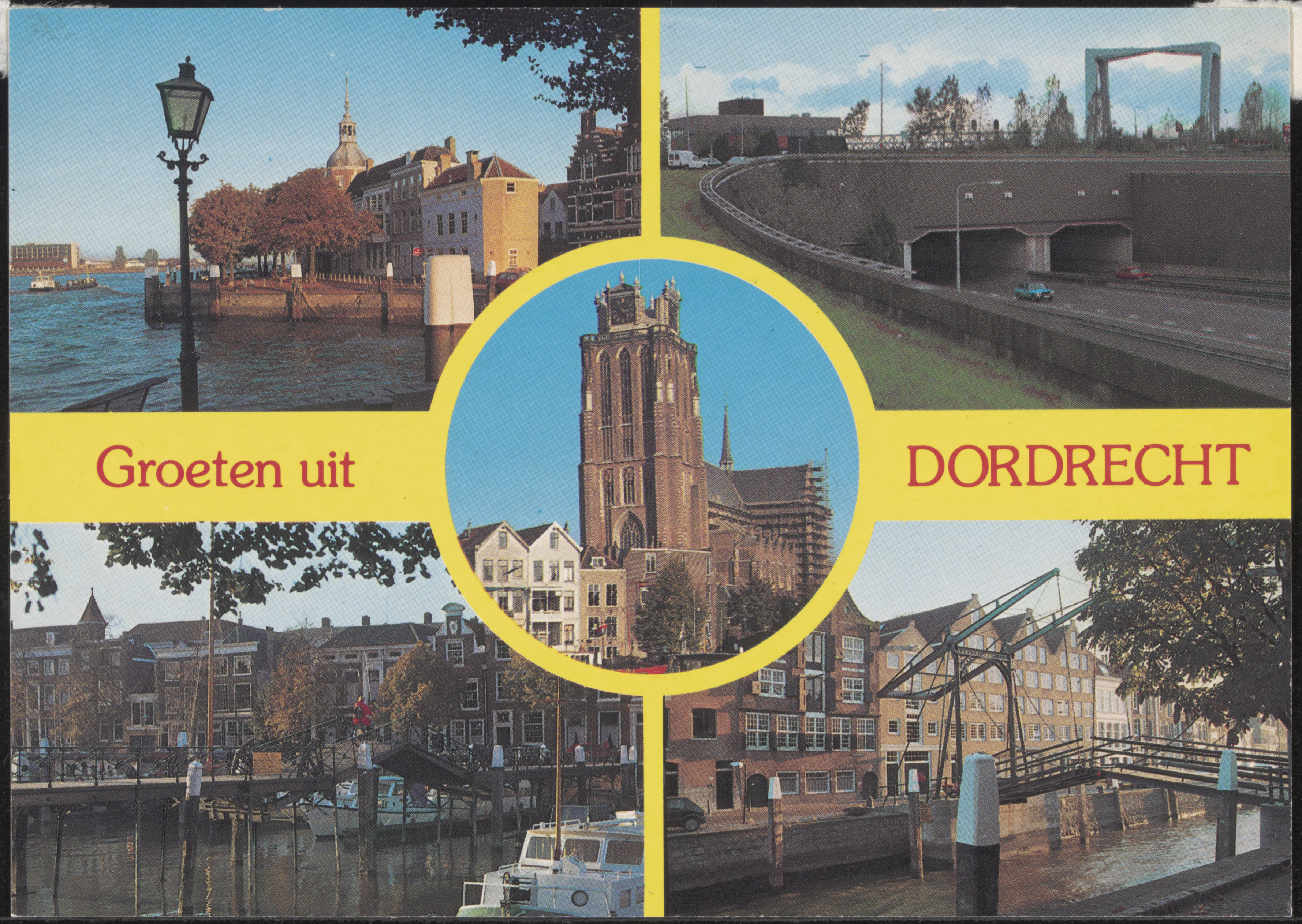 LB: Groothoofd. M: Grote Kerk. RB: Drechttunnel en spoorhefbrug. LO: Nieuwe Have. RO: Wolwevershaven met Damiatebrug.